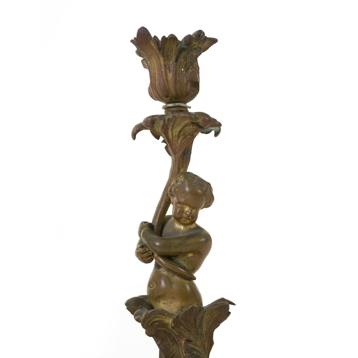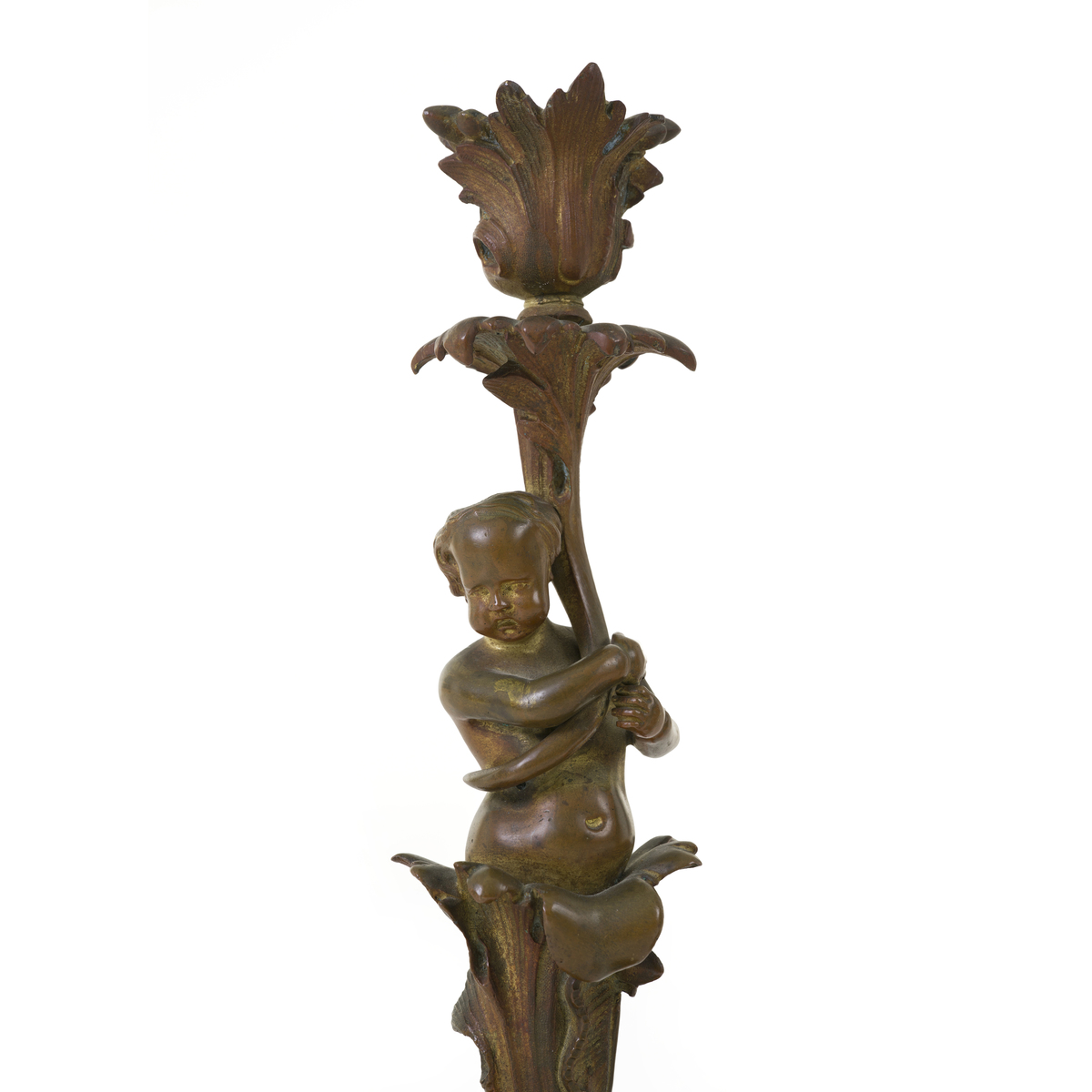 Elaborate base and stem with cherubs.