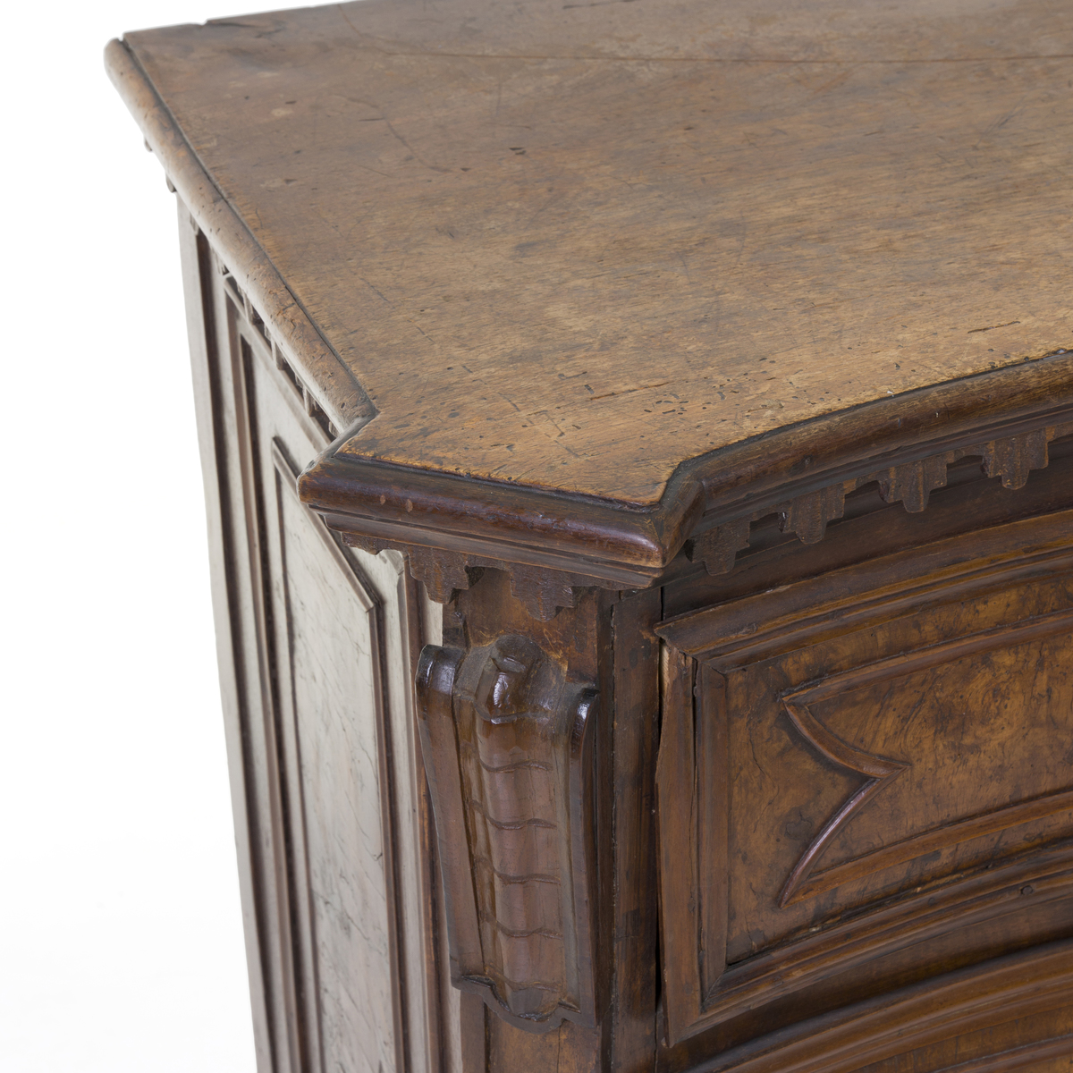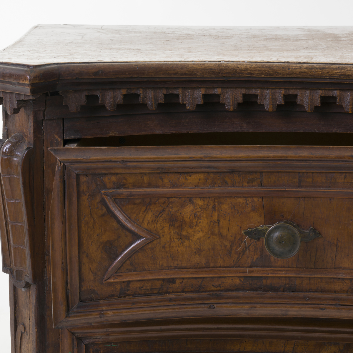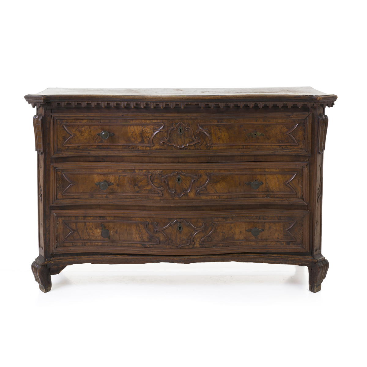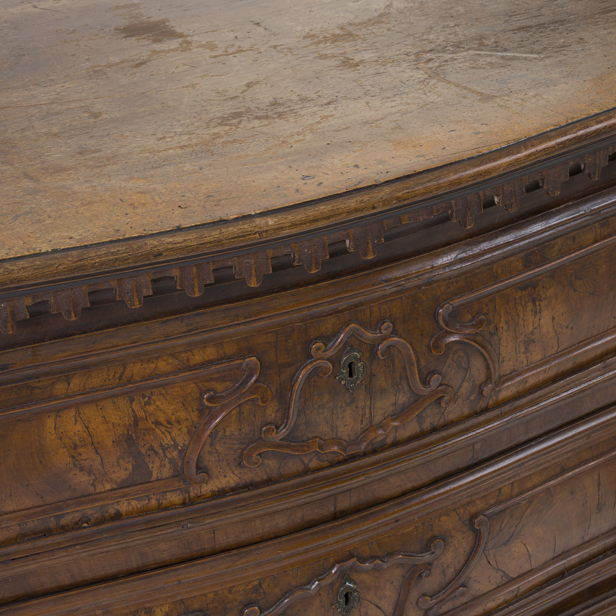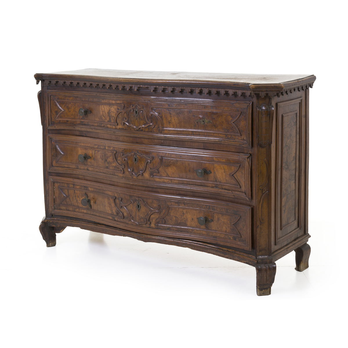 Fronte mosso a tre cassetti con riserve lastronate in radica di noce.