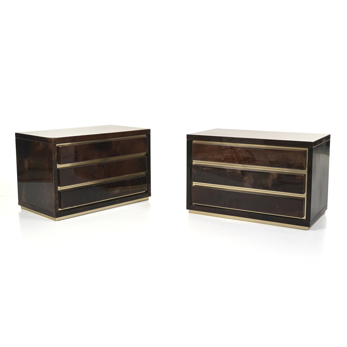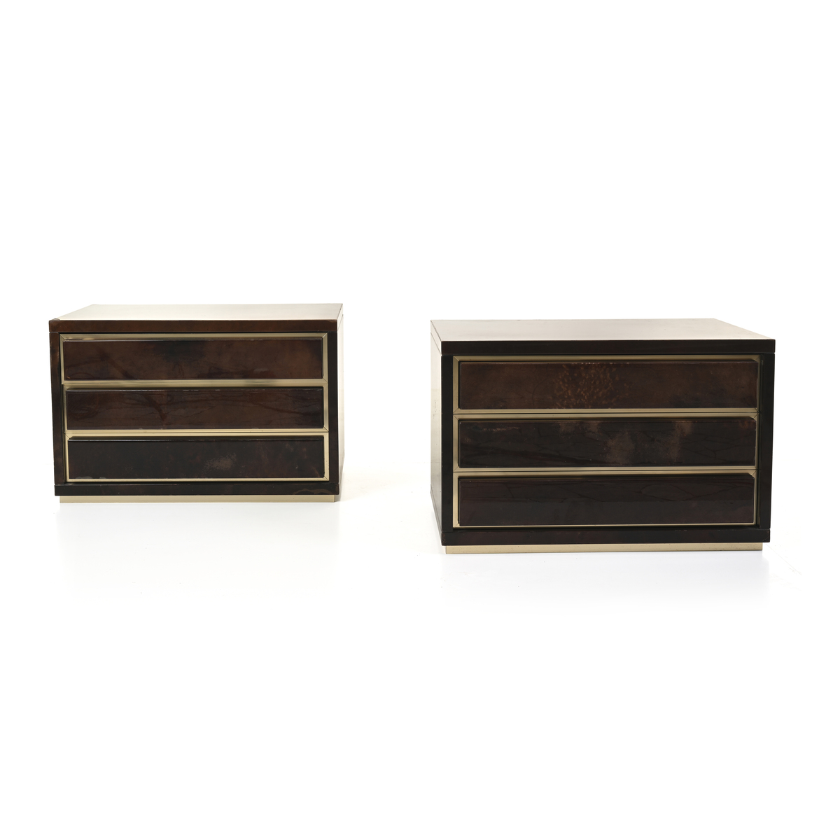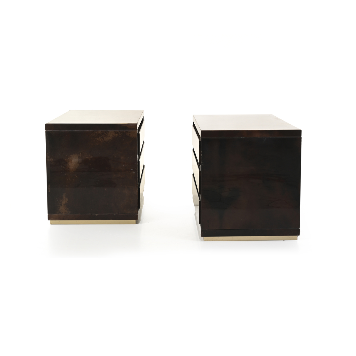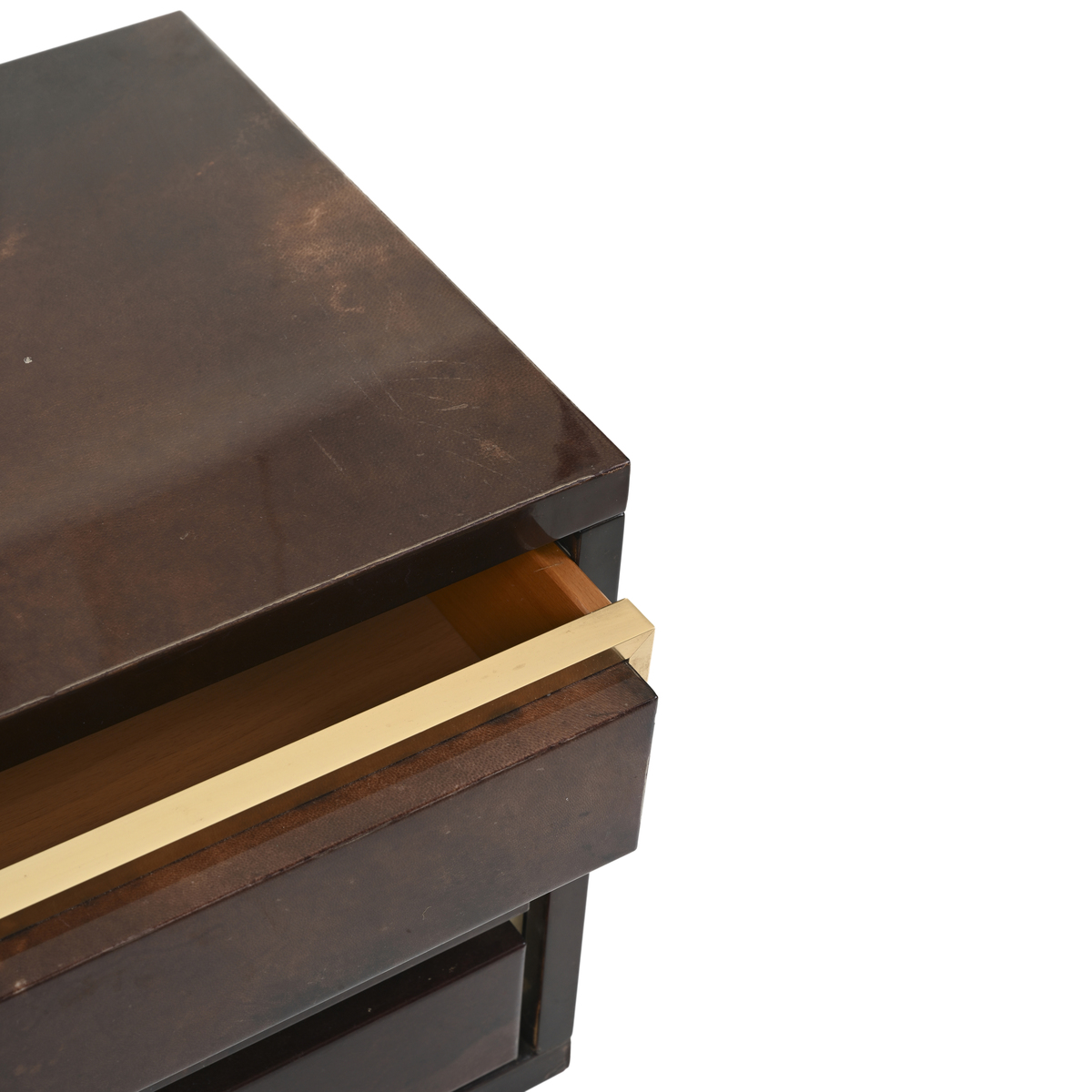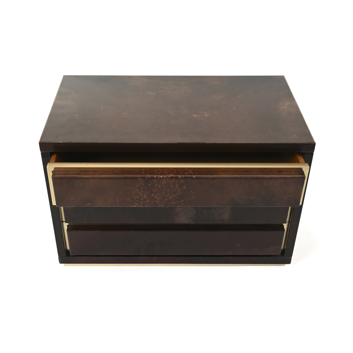 Wooden frame, stained parchment upholstery, resin coating, and brass trim