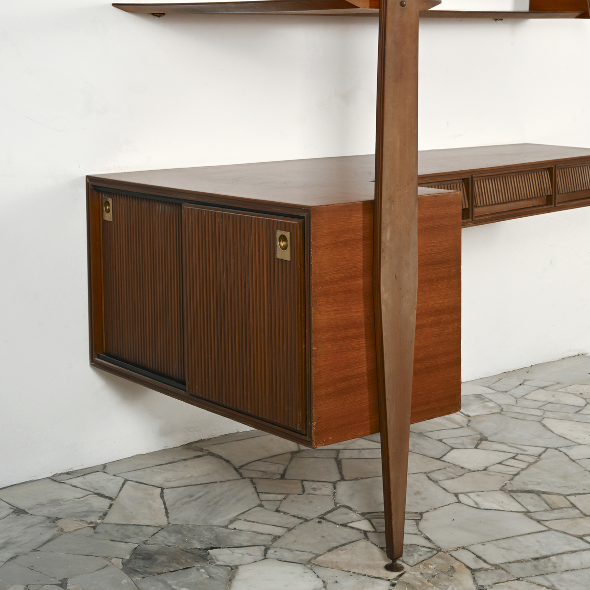 Struttura in legno impiallacciato, ante laterali e cassetti in legno grissinato, dettagli in ottone