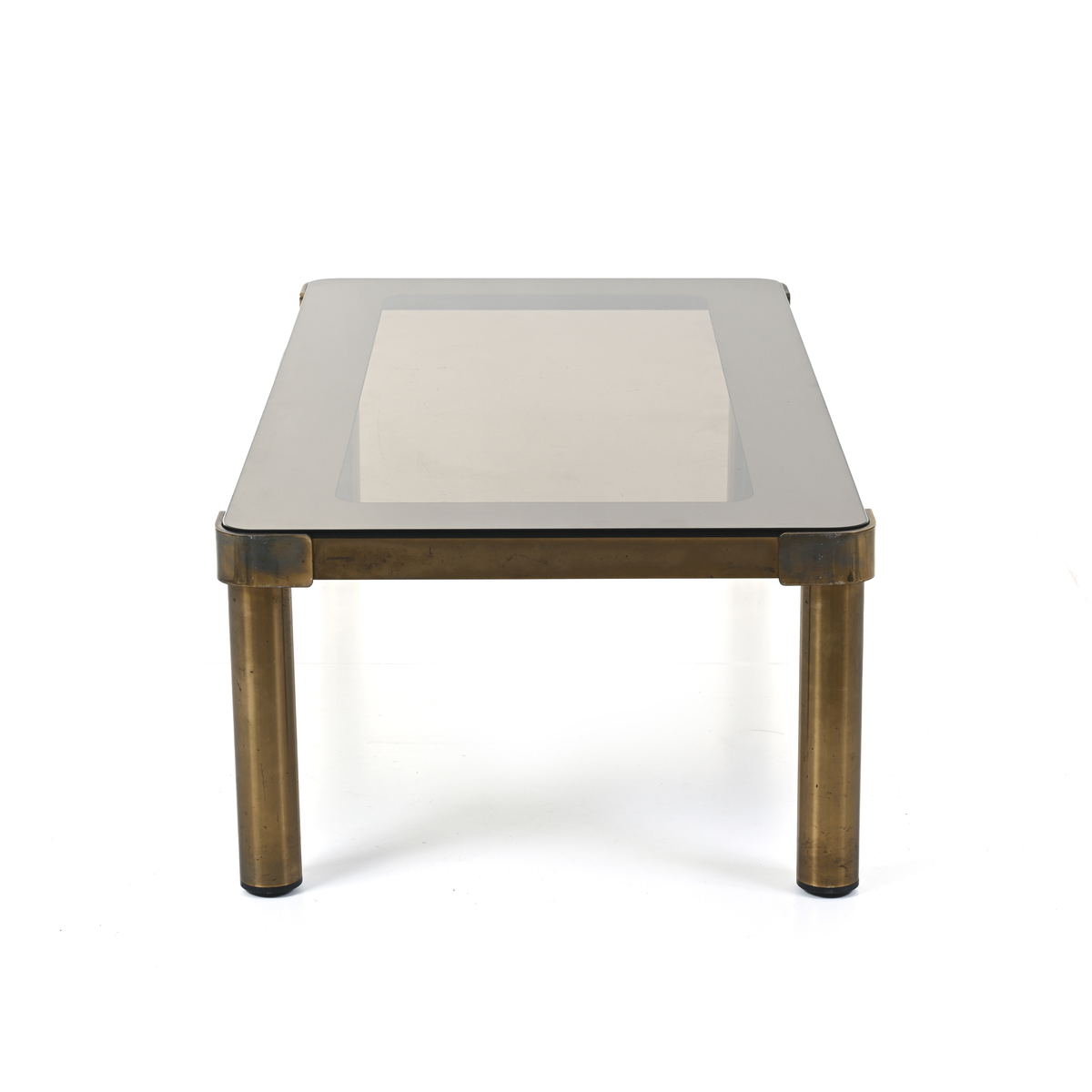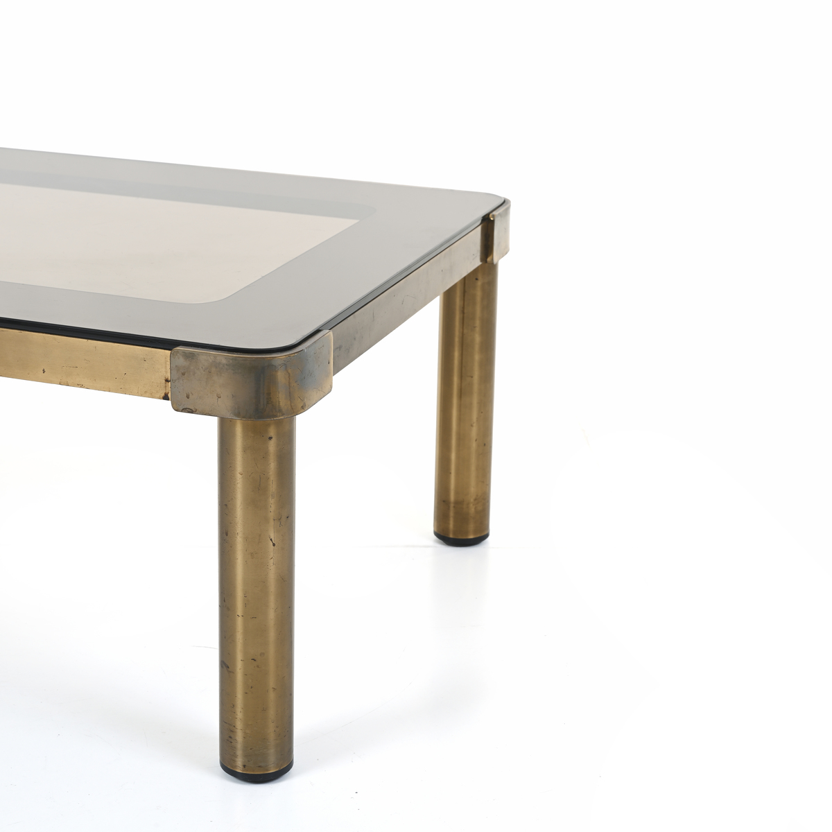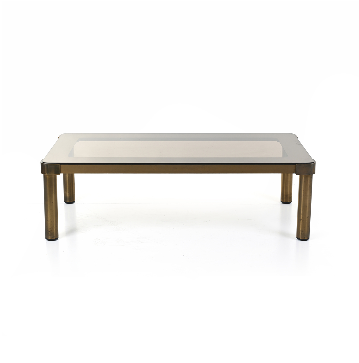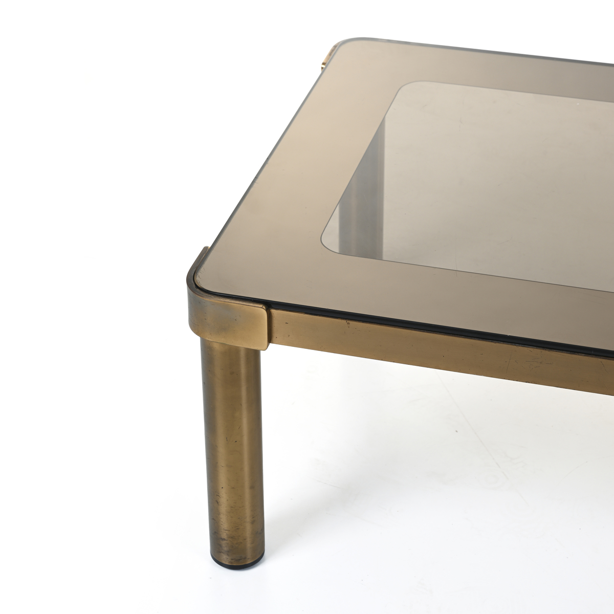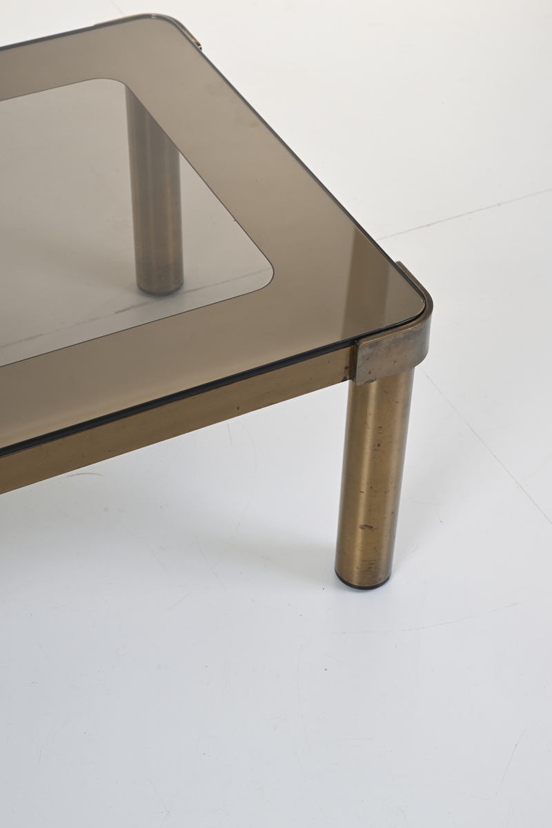 Struttura in ottone, piano ad incastro in cristallo molato e parzialmente specchiato
