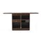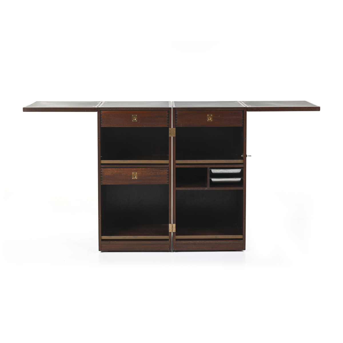 Struttura in legno, piano superiore estensibile, rivestimenti in pelle e dettagli in ottone