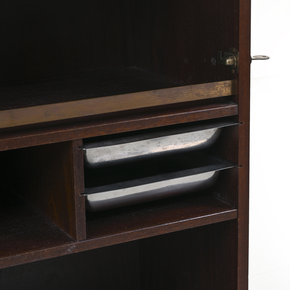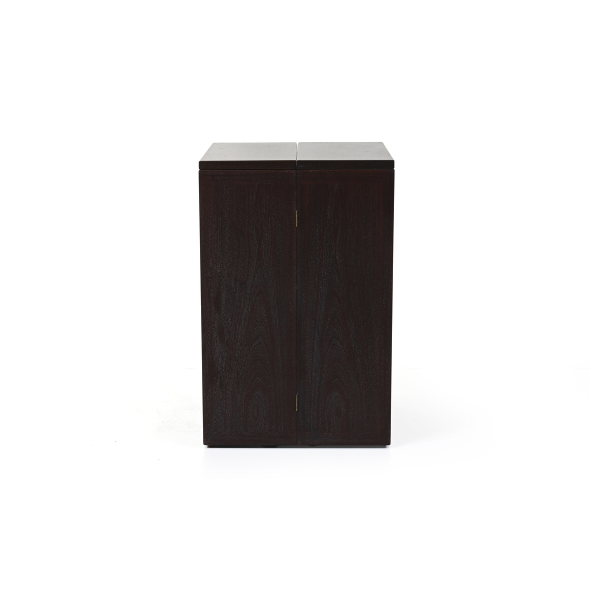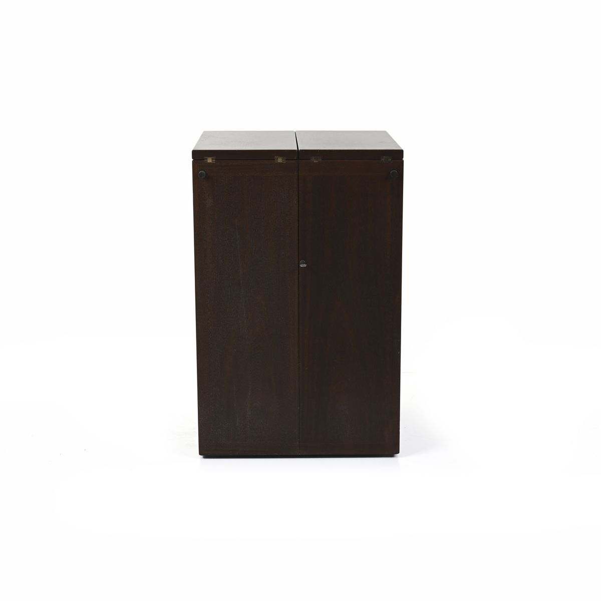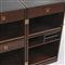 Wooden structure, extendable top shelf, leather upholstery, and brass details