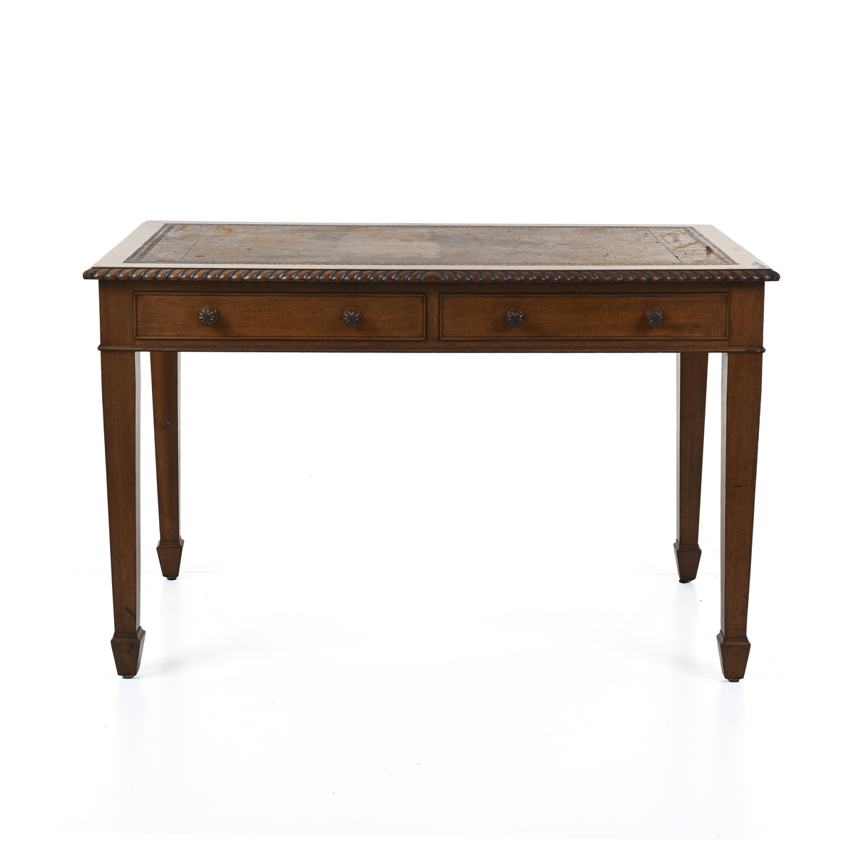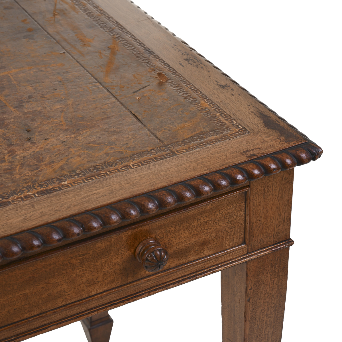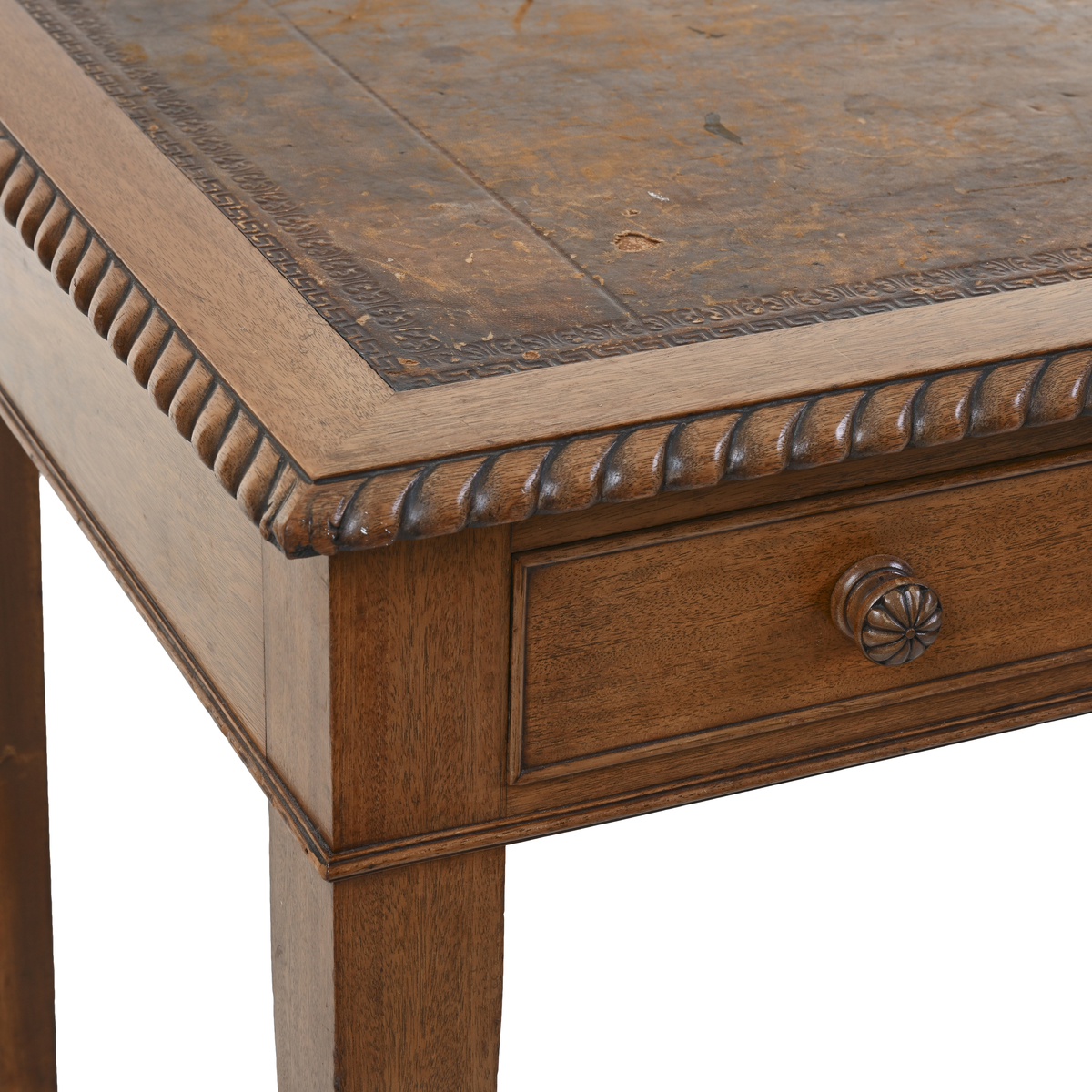 Struttura e sostegni in legno, bordi lavorati, ripiano in pelle decorata
