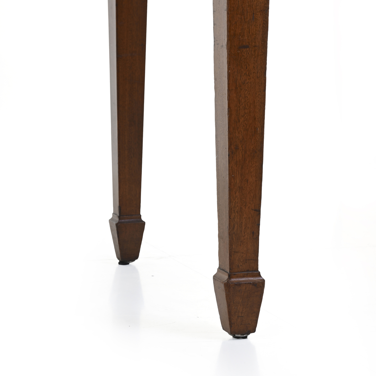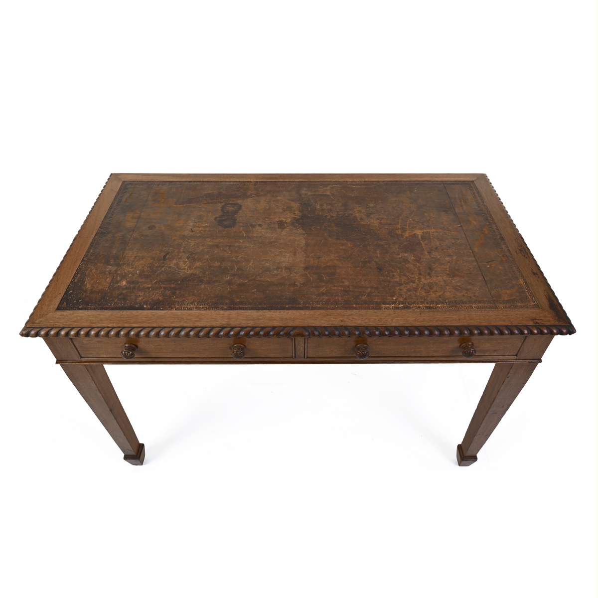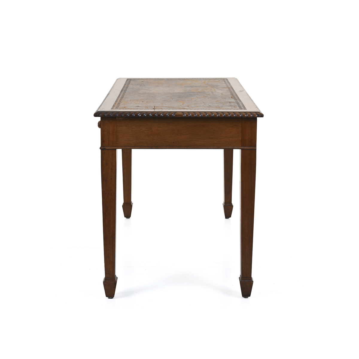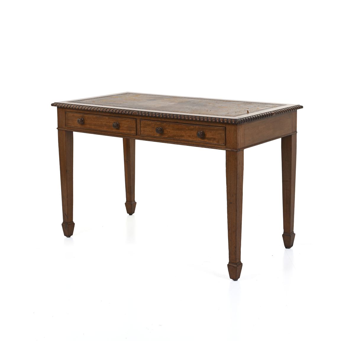 Struttura e sostegni in legno, bordi lavorati, ripiano in pelle decorata
