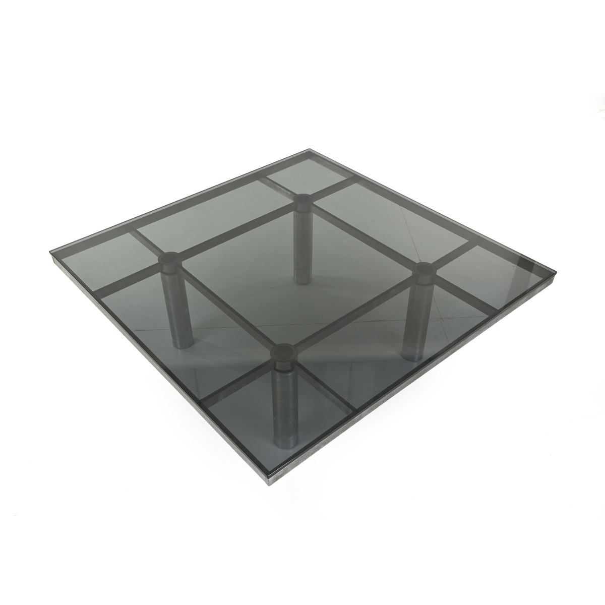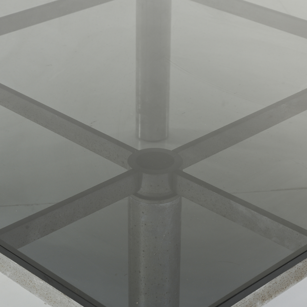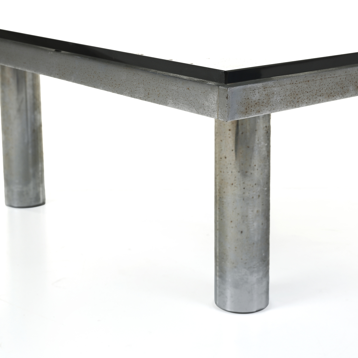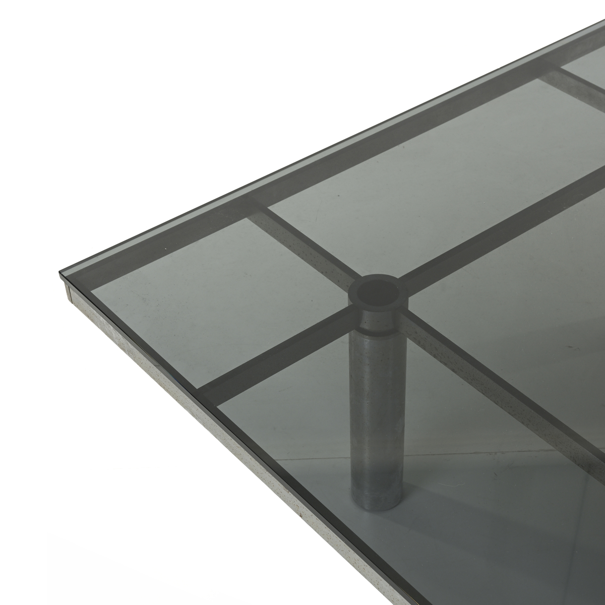 Struttura e sostegni in acciaio cromato, ripiano in vetro fumé
