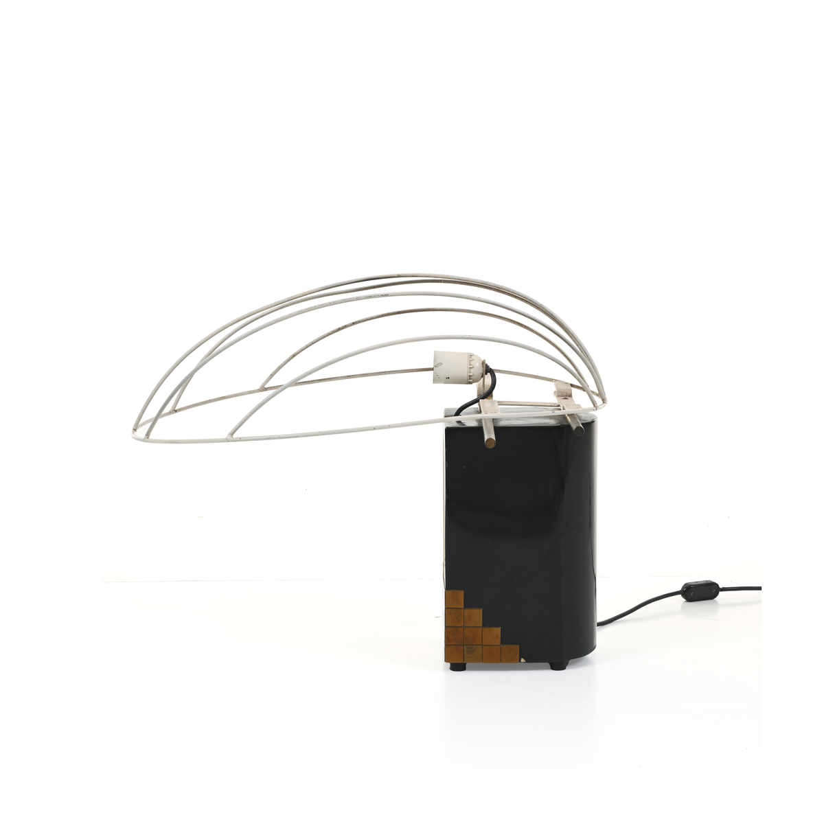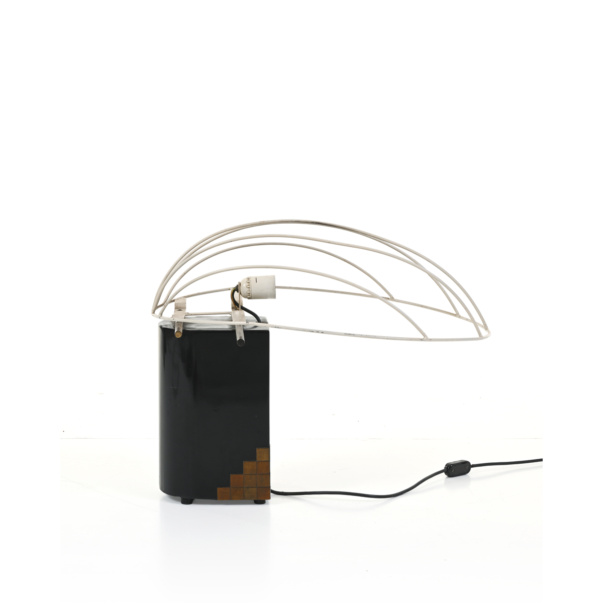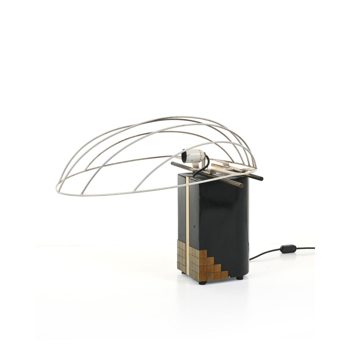 Struttura in legno verniciato e ottone, diffusore in metallo patinato e ottone