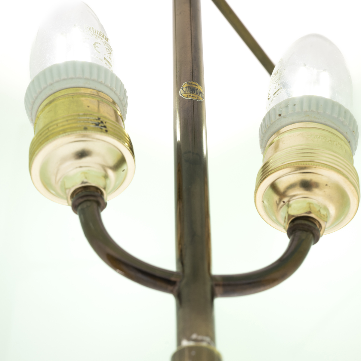 White marble base, adjustable brass stem, white and green plexiglass diffusers