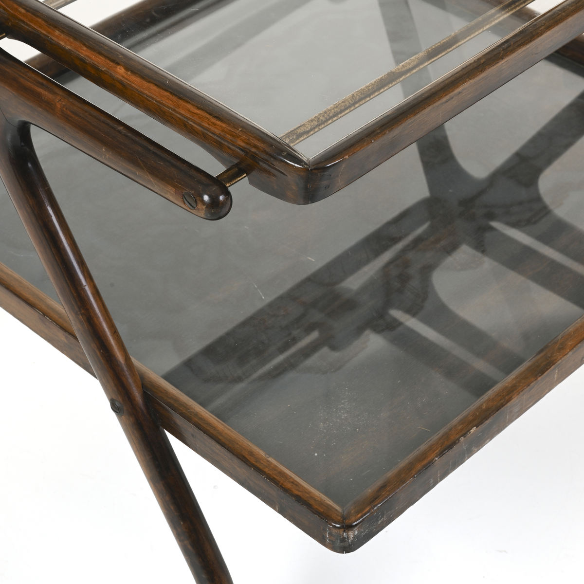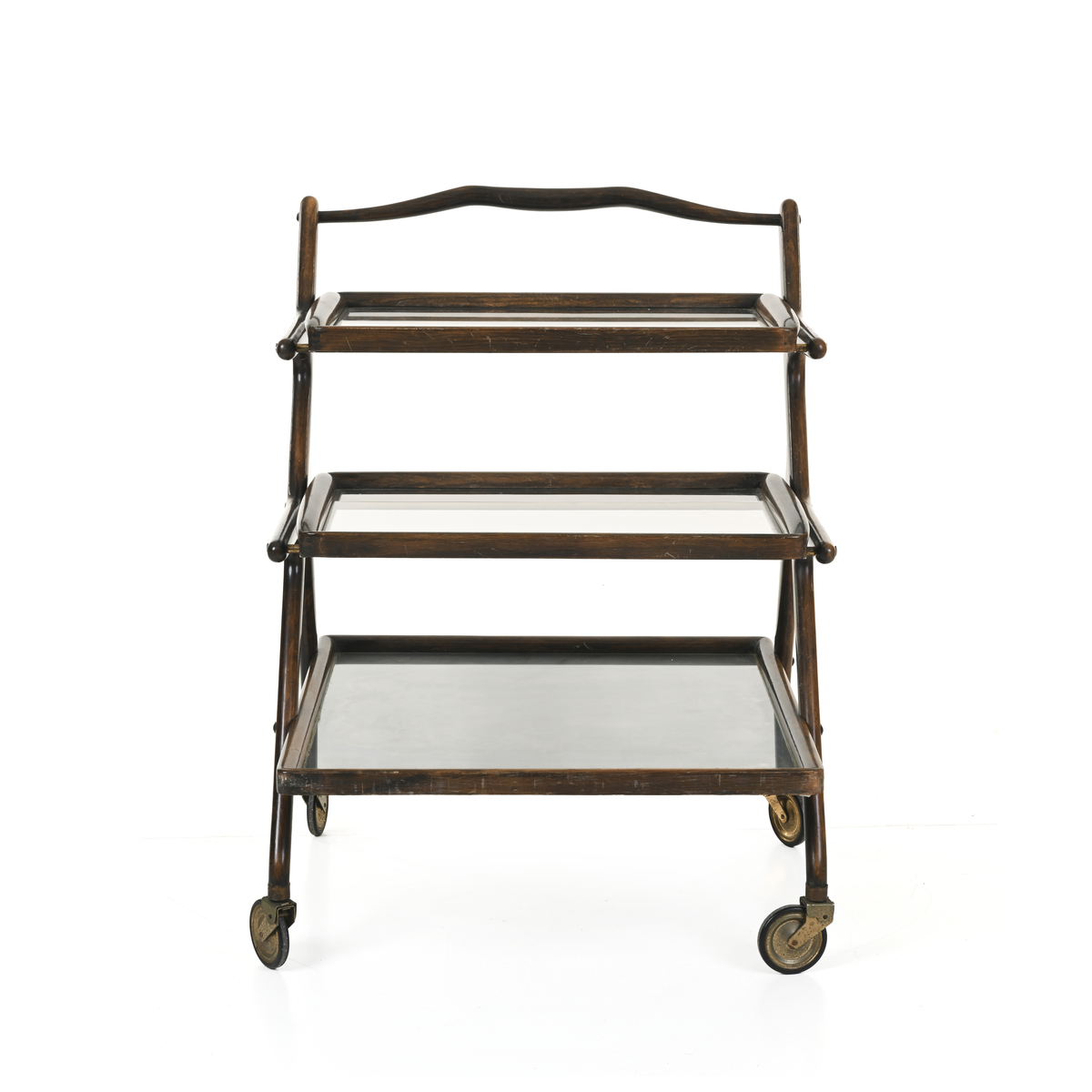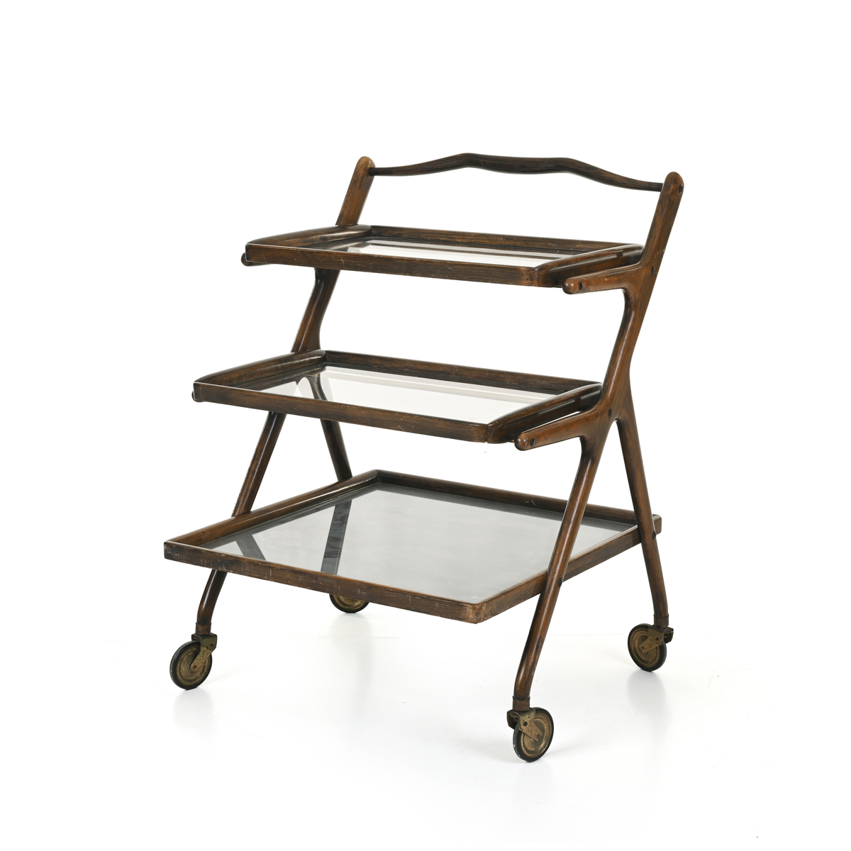 Struttura in legno, dettagli in ottone, ripiani in legno e cristallo molato trasparente