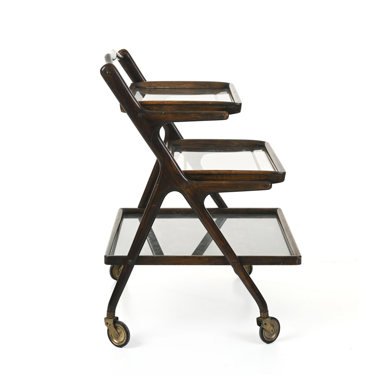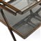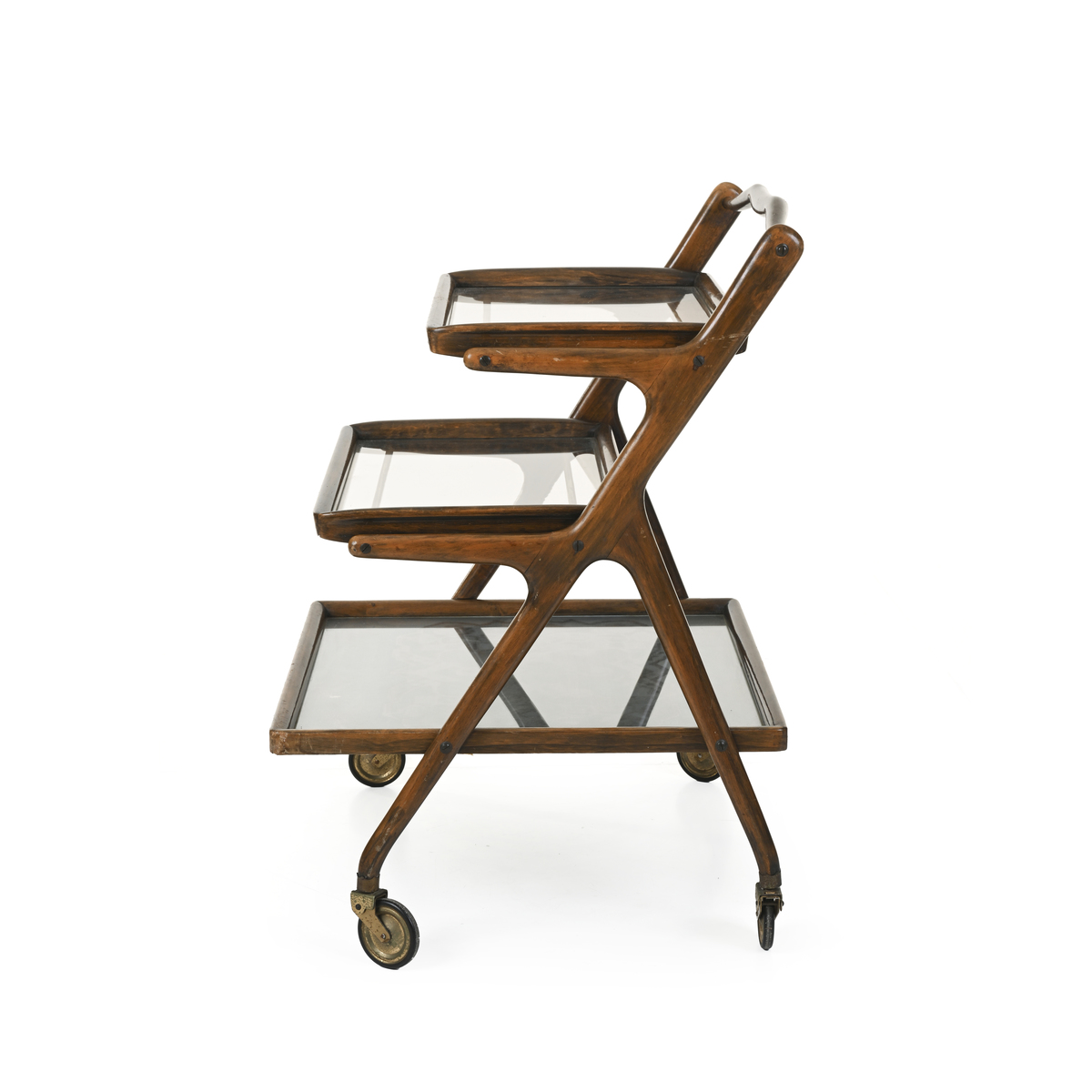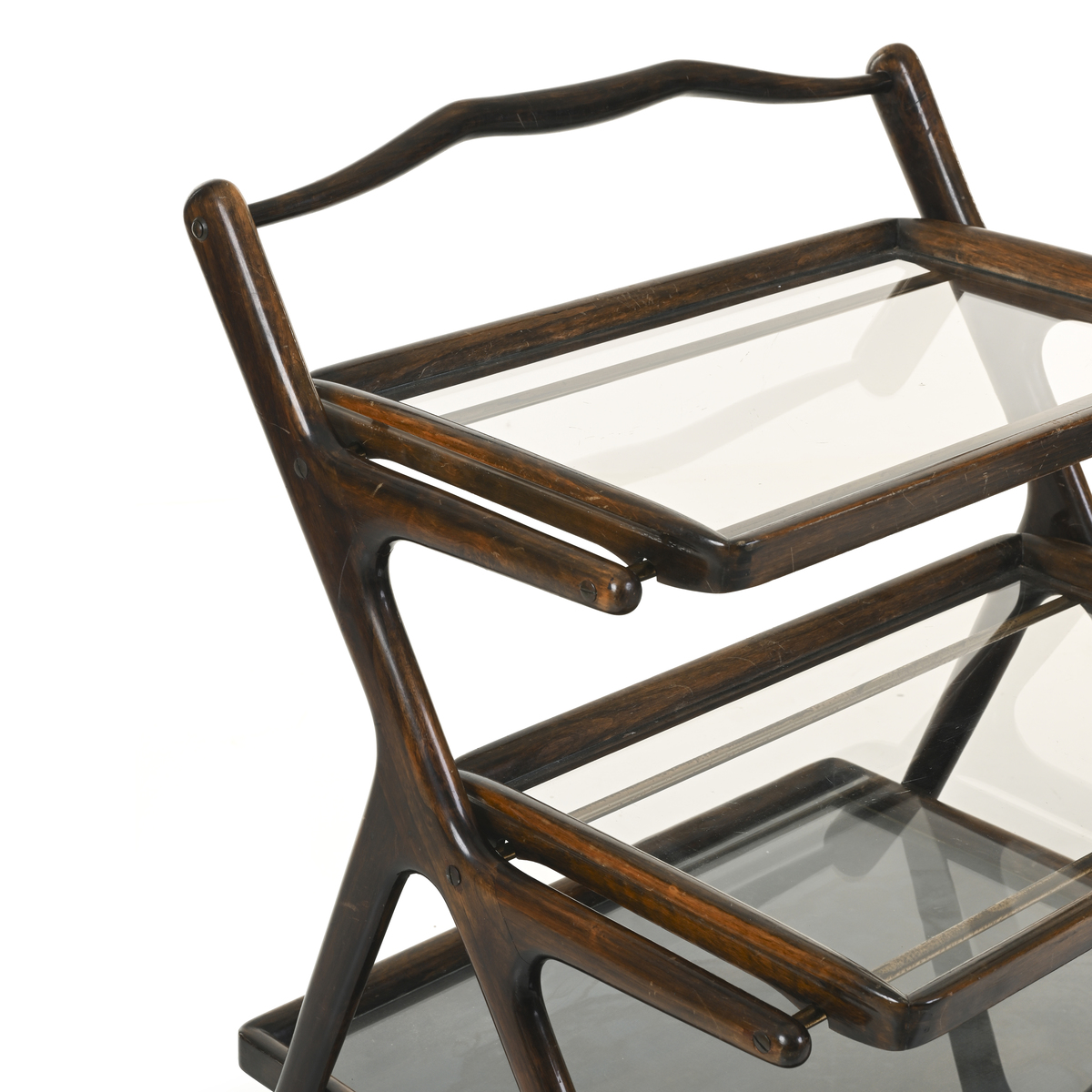 Struttura in legno, dettagli in ottone, ripiani in legno e cristallo molato trasparente