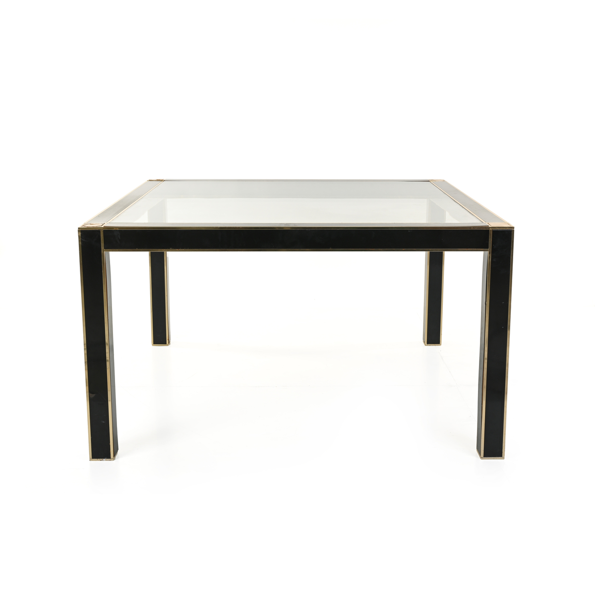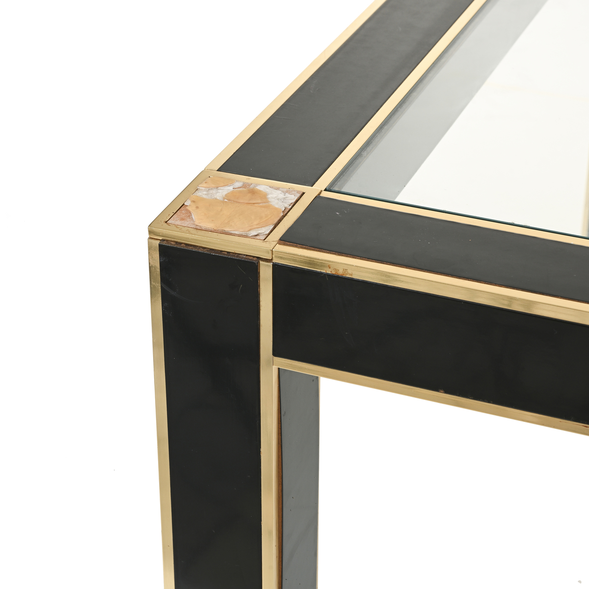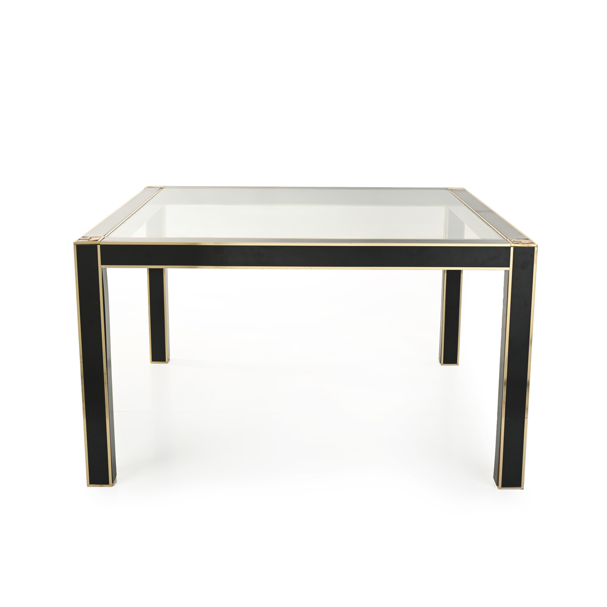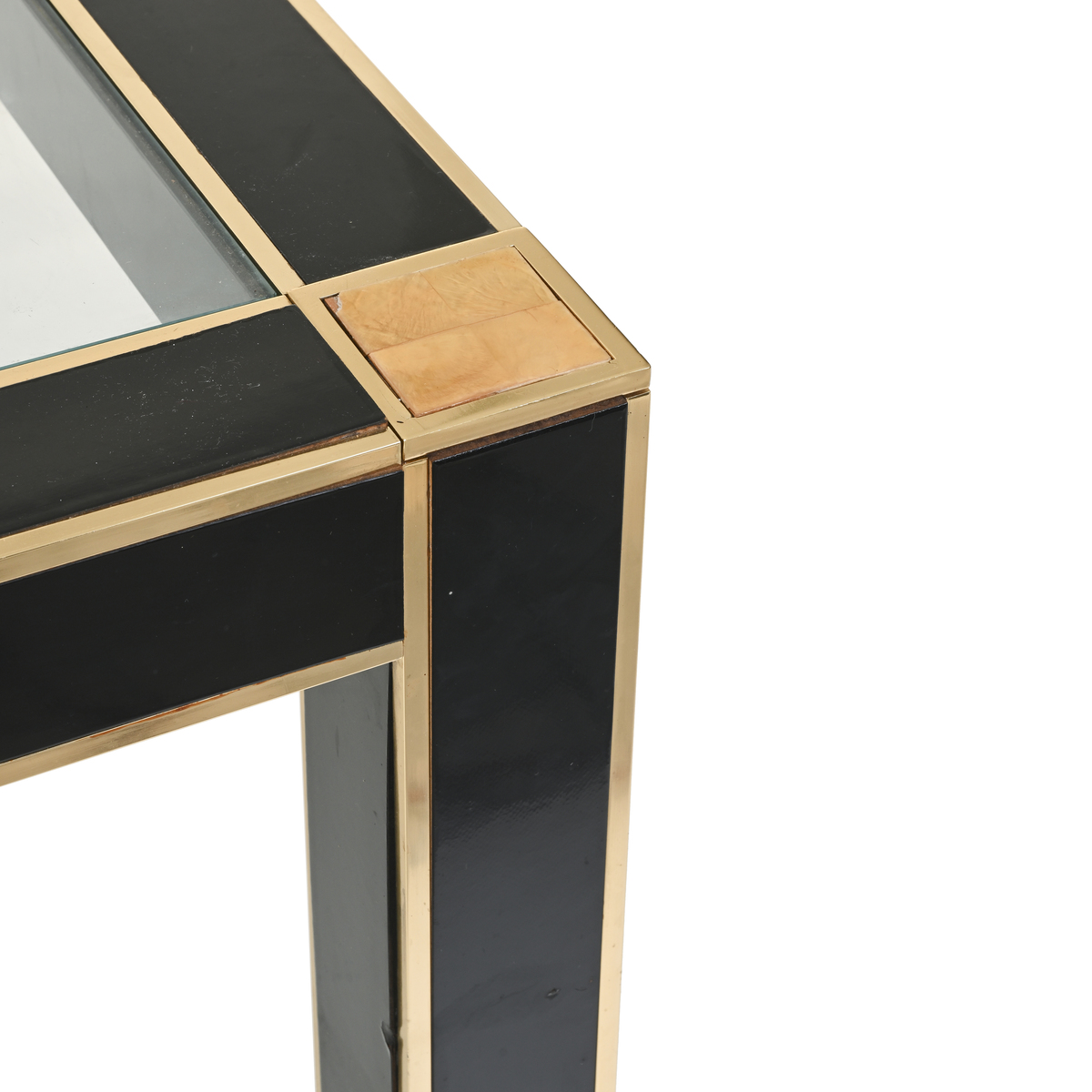 Struttura in legno laccato nero, profili in ottone e madreperla, ripiano in cristallo molato trasparente