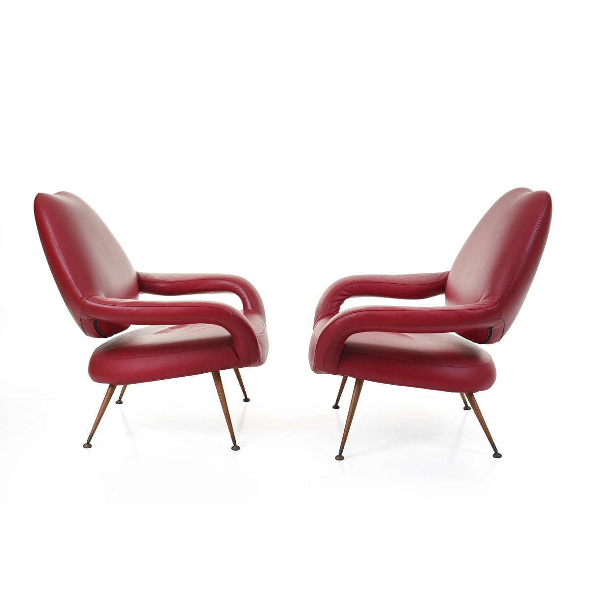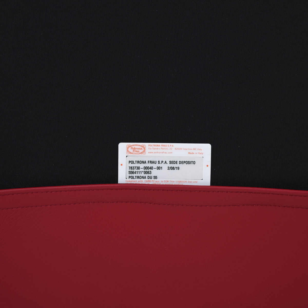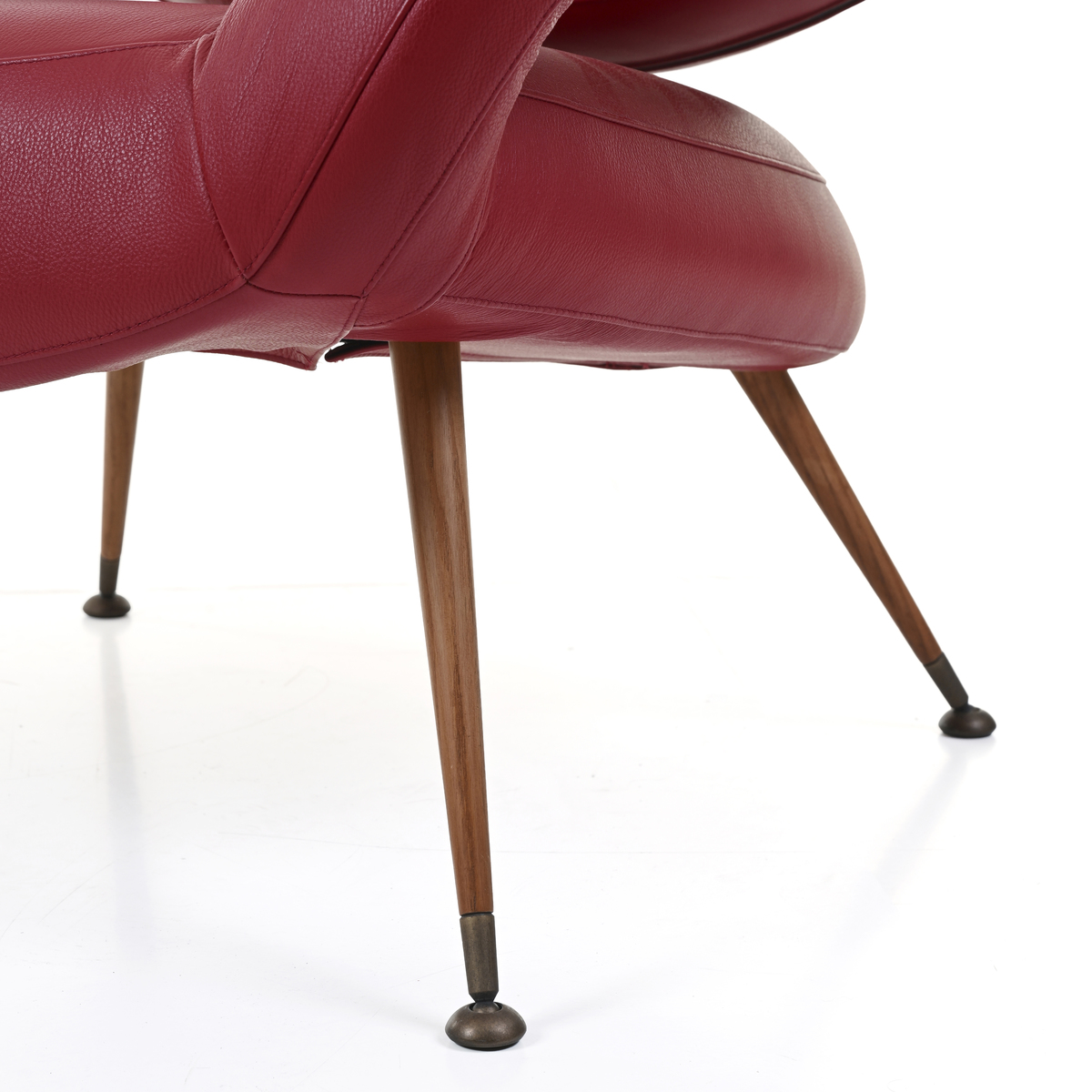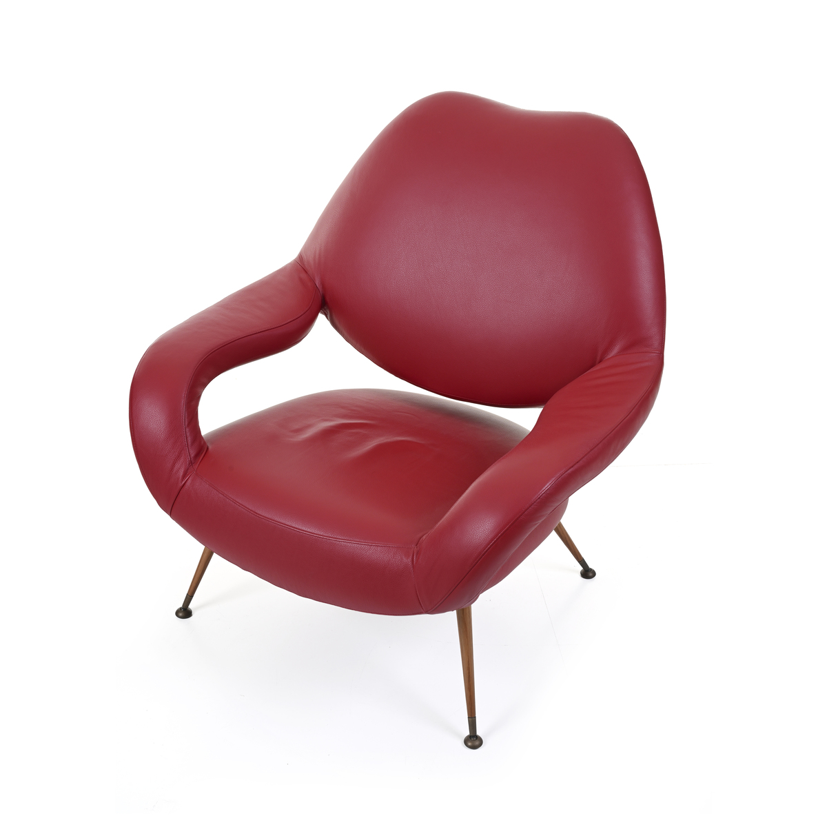 Struttura in legno, rivestimenti in pelle tinta rossa, piedini in ottone