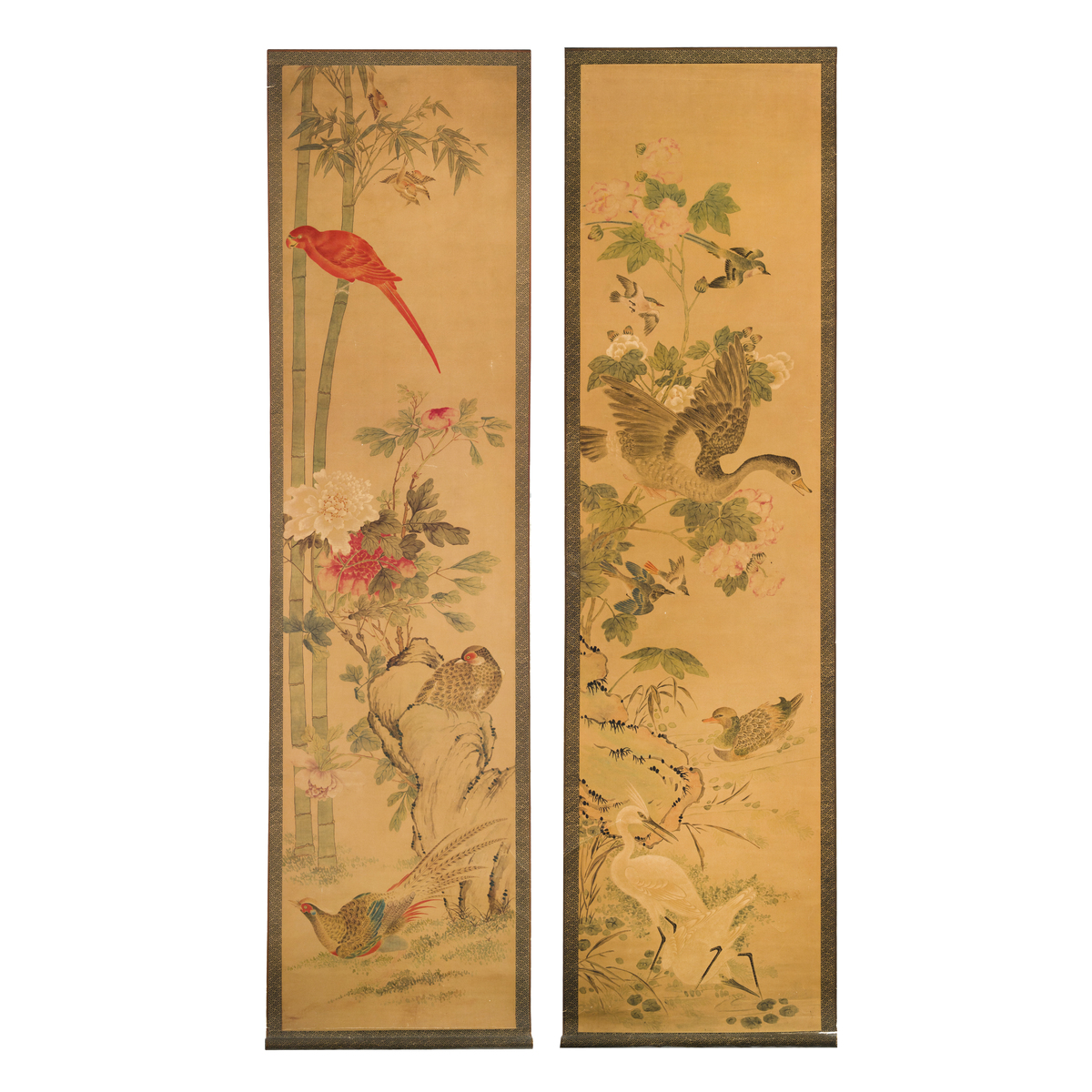 Two scroll paintings decorated with birds and flowers within a landscape