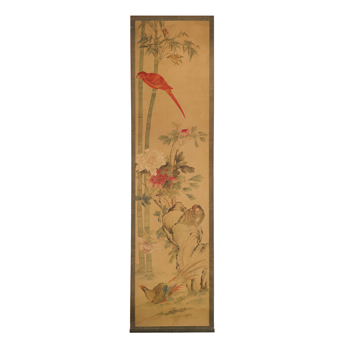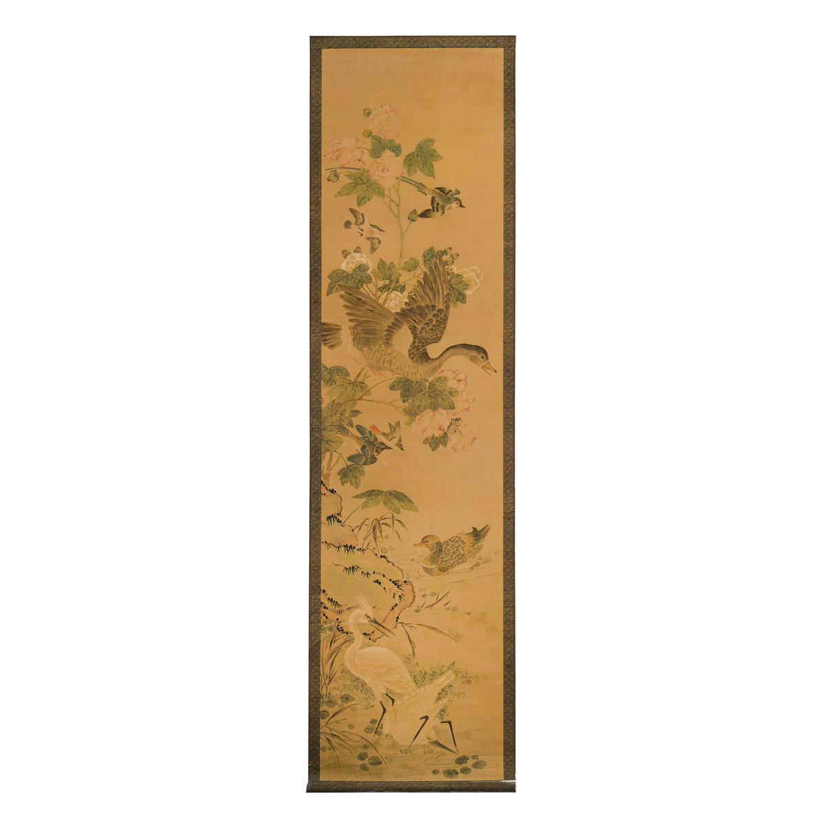 Due dipinti a scroll con decoro di uccelli e fiori entro paesaggio