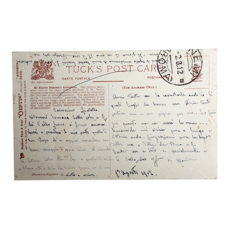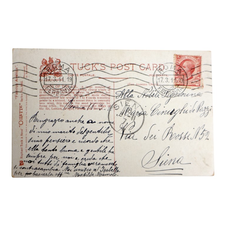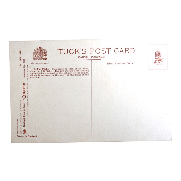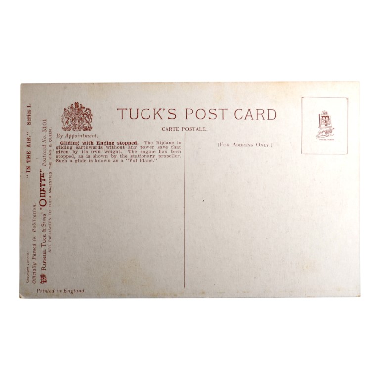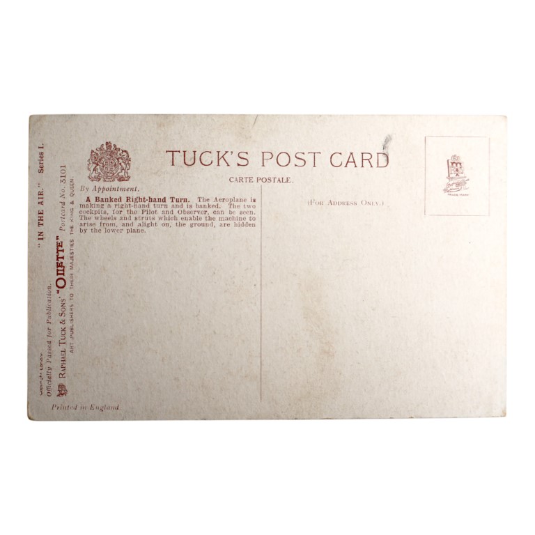Dedicate alle prime sperimentazioni aeronautiche, agli aeroplani pionieristici e ai protagonisti dell'aviazione delle origini. Editore Raphael Tuck & Sons, serie Oilette 'In the Air' e 'Famous Aeroplanes', con diciture editoriali Tuck's Post Card / Tuck's Postkarte, By Appointment to Their Majesties the King & Queen, Printed in England. Soggetti comprendenti Climbing, Gliding with engine stopped, A banked right-hand turn, In full flight, The Wright Biplane, M. Santos Dumont's Aeroplane e altre scene di volo pionieristico. Illustrazioni firmate Oilette, G. T. Clarkson e N. Bérard. Presenti esemplari viaggiati con annulli postali e francobolli, testi manoscritti coevi al verso. Condizioni complessivamente buone, con naturale patina del tempo, lievi bruniture e sporadiche fioriture, minime tracce d'uso ai bordi e agli angoli, stato di conservazione coerente con l'epoca e l'uso postale.