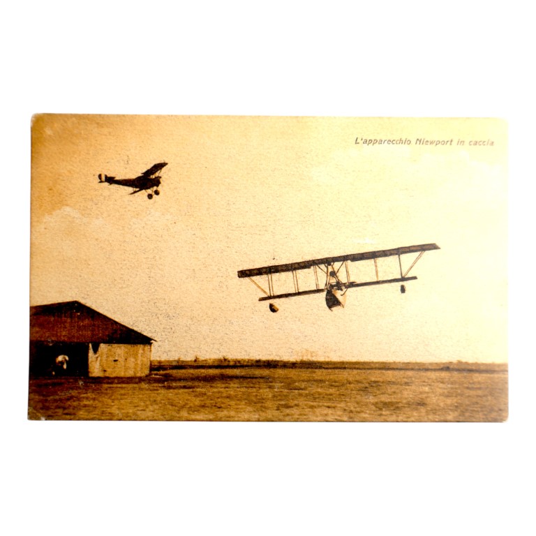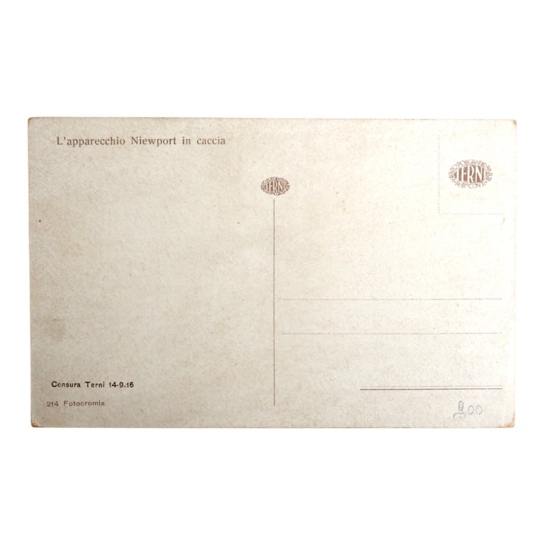 Le immagini raffigurano un biplano Nieuport in manovra, con titolo a stampa 'L'apparecchio Nieuport in caccia'. Due cartoline sono a colori, stampate in fotocromia da Fotocromia - Terni, entrambe con timbro 'Censura Terni 14.9.16'; una delle due è viaggiata con annullo postale datato 23 ottobre 1918. La terza cartolina, in bianco e nero, è stampata in fototipia da IPA - C.T. Condizioni complessivamente buone, con patina d'epoca e lievi tracce d'uso coerenti con l'età e la circolazione postale.