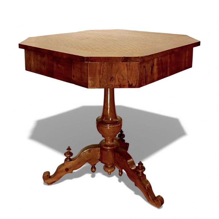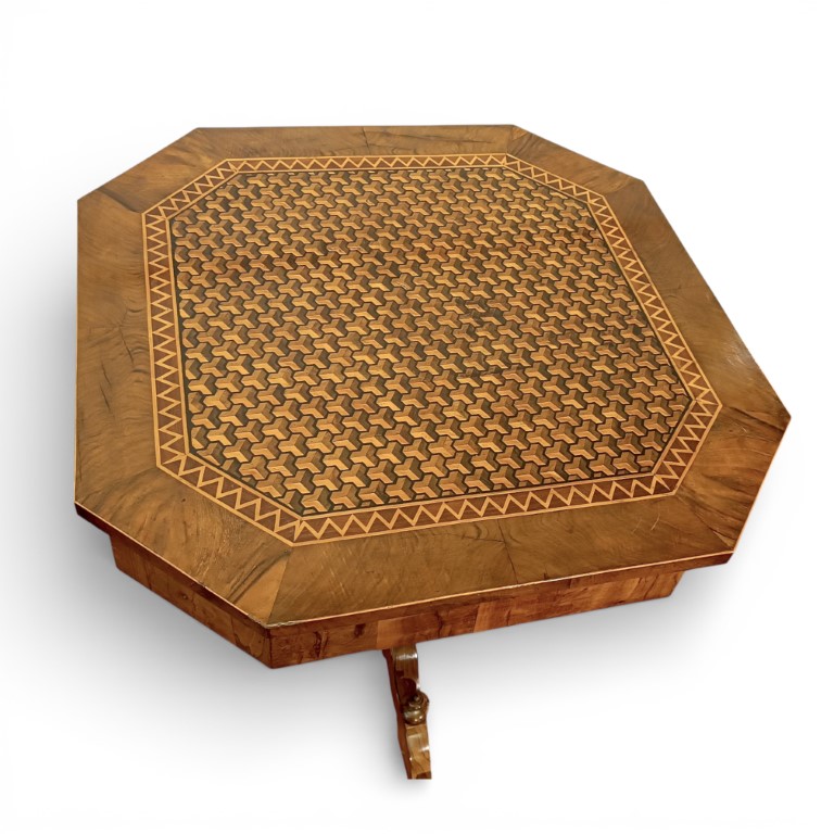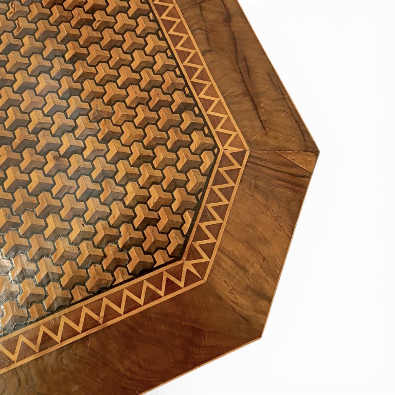 Tavolino in noce intarsiato a motivo geometrico prospettico