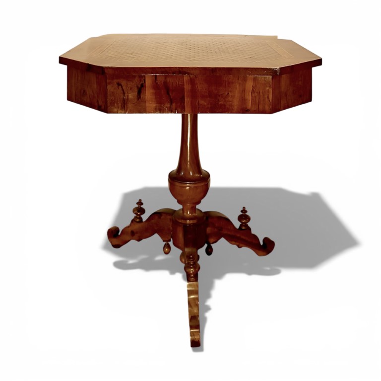 Piano ottagonale, fusto a balaustro su tre gambe mosse decorate da pinnacoli