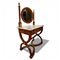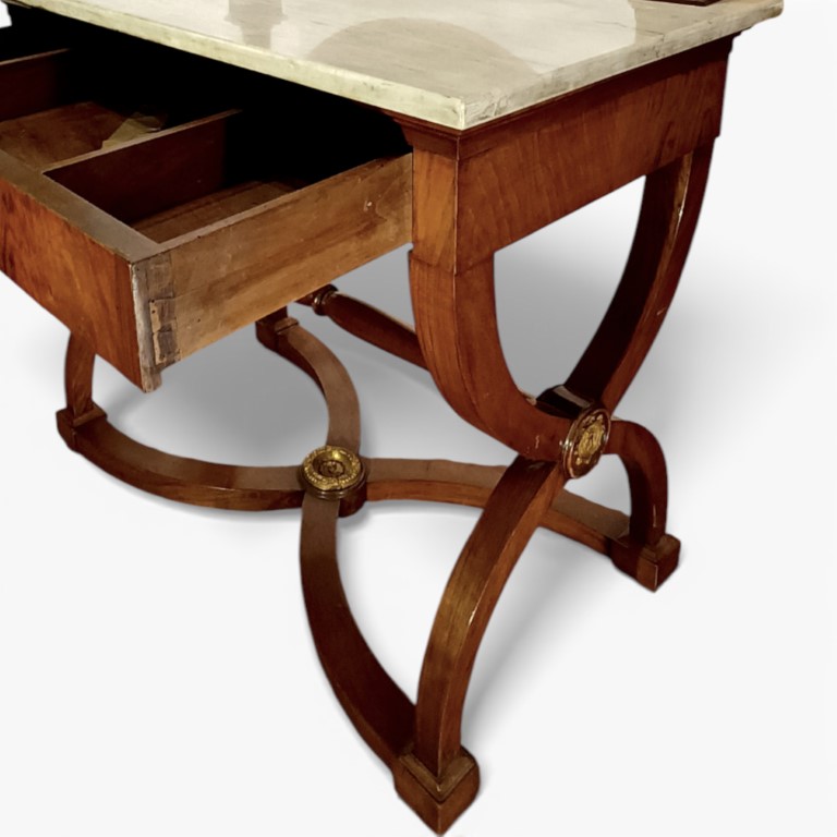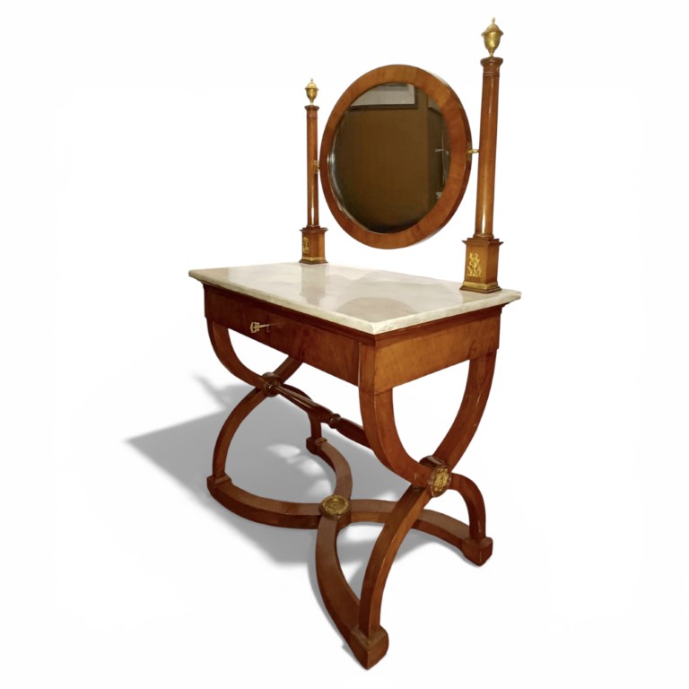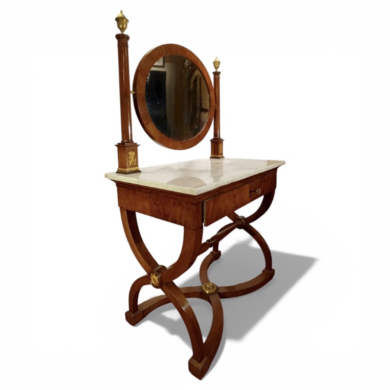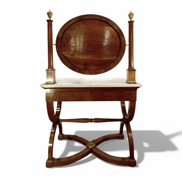 Con applicazioni in bronzo dorato, specchio ovale a psiche con sostegni a colonna e cimasa a vaso in bronzo dorato e cesellato, piano in marmo bianco, un cassetto nella fascia, gambe incrociate a faldistorio, riunite da traversa tornita e crociera sagomata con borchia centrale in bronzo dorato.