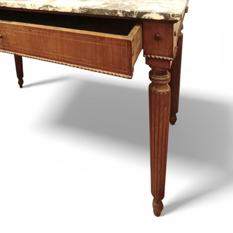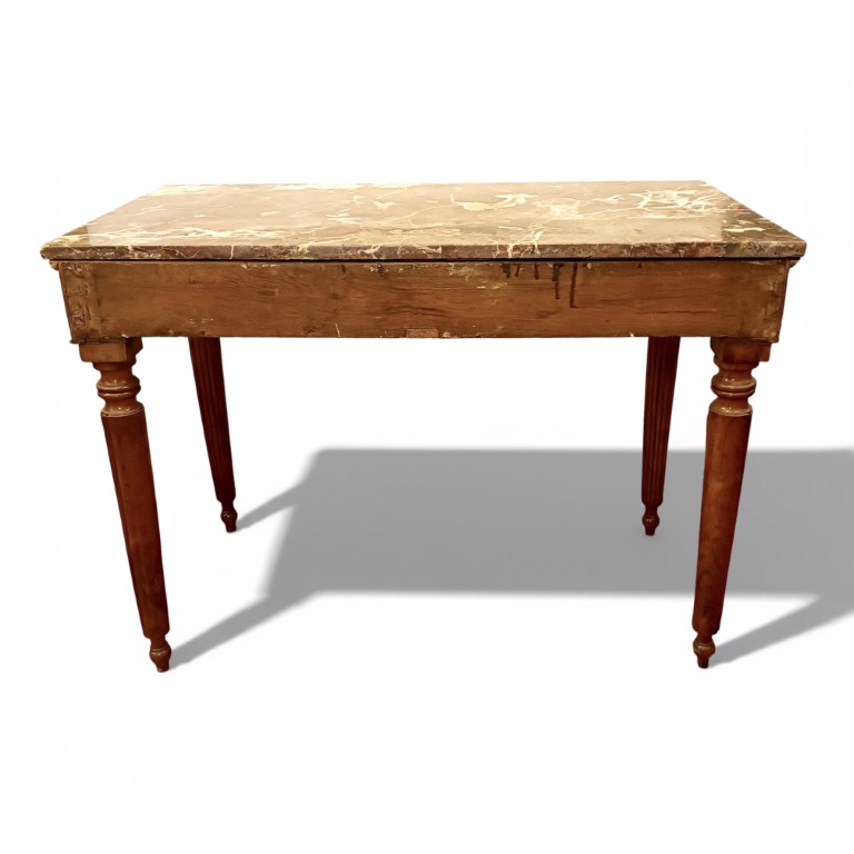 Piano in breccia di marmo rossa, un cassetto nella fascia, gambe scannellate