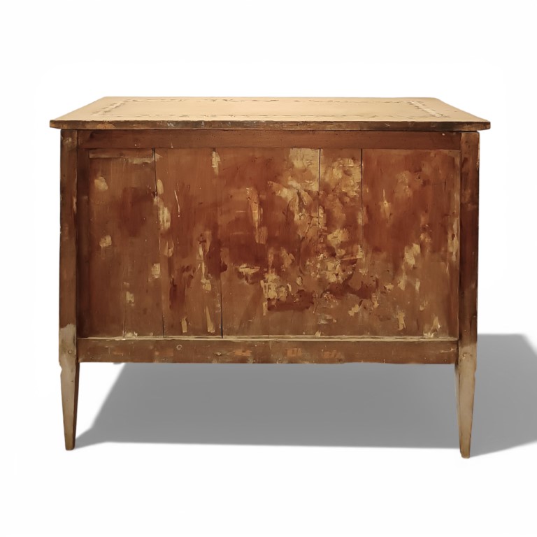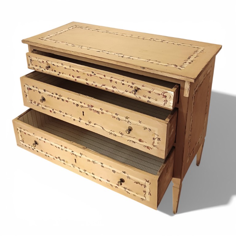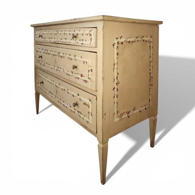 Cassettone in legno dolce dipinto color avorio e decorato a motivi fitomorfi