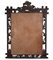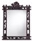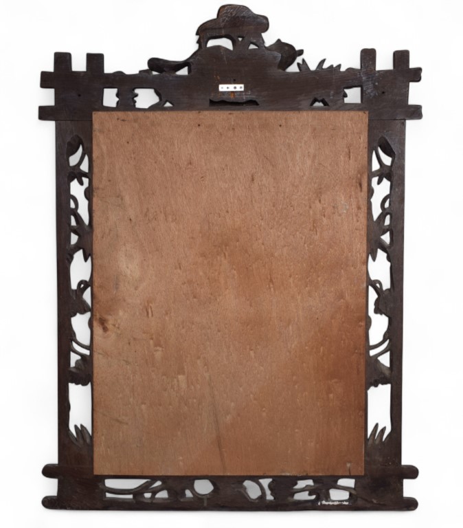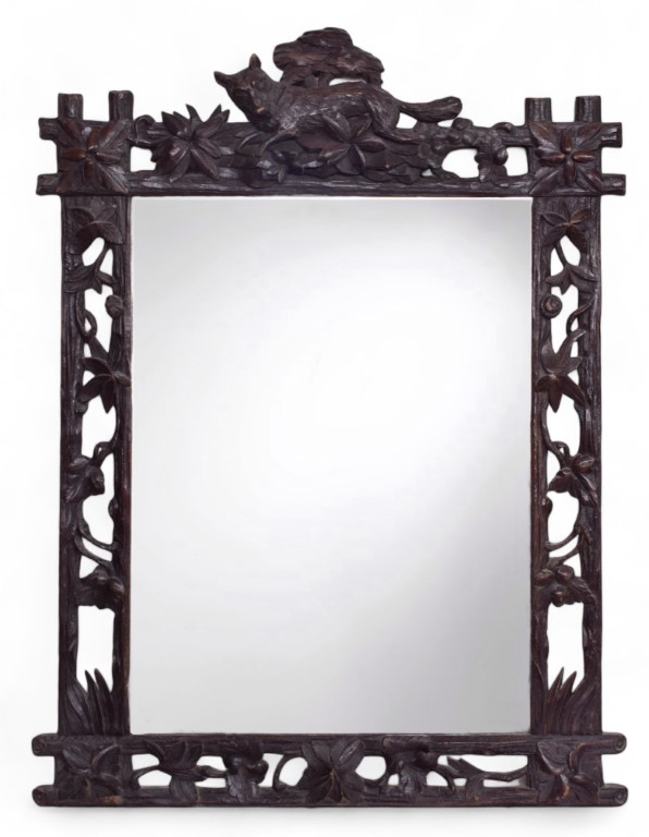 Bella cornice con specchio in legno intagliato a patina scura, decorata a motivi di volute vegetali e volpe.