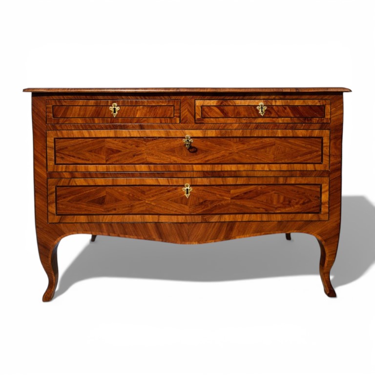 Cassettone a balestra in noce scuro e noce biondo e filettato in ebano