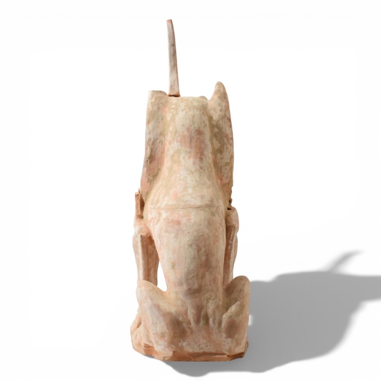 Imponente figura in terracotta stampata raffigurante un leone mitologico accucciato.
