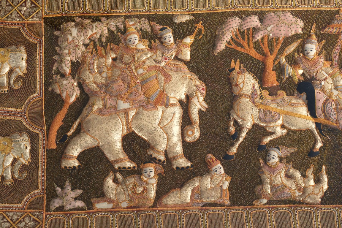 Lot 151 | Pannello tessile indiano ricamato raffigurante scena mitologica con figure ed elefanti