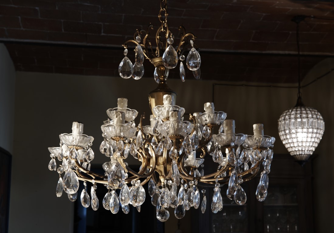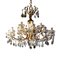 Lampadario in metallo dorato e pendenti in cristallo sfaccettato