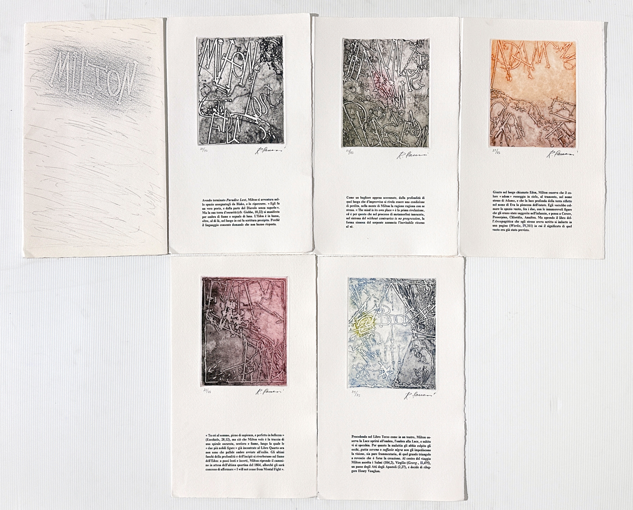 Edizione d'arte dedicata al Paradise Lost di John Milton contenente 5 incisioni a colori di Roberto Sanesi, ciascuna recante firma e numerazione (Esemplari 25/75) a matita al fronte