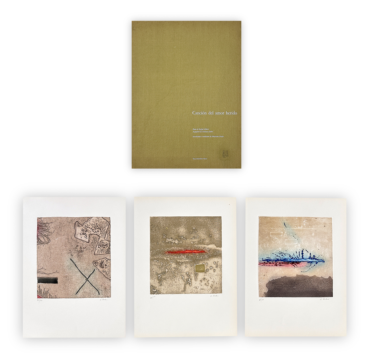 Cartella contenente introduzione e traduzione di Sebastiano Grasso e poesie di Rafael Alberti illustrate da 3 acqueforti di Cristiana Isoleri, ciascuna recante firma e numerazione (Esemplare 82/120) a matita al fronte