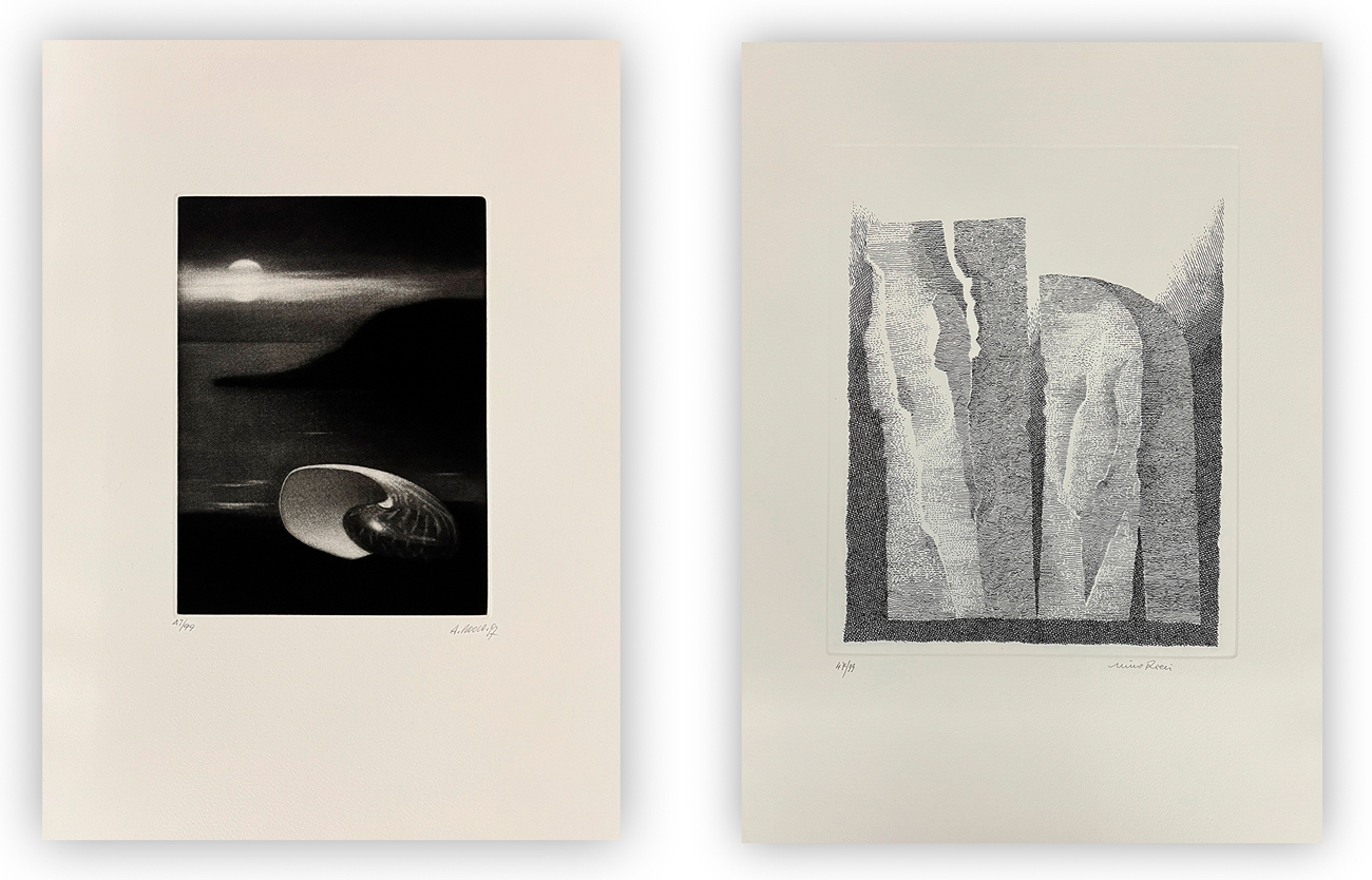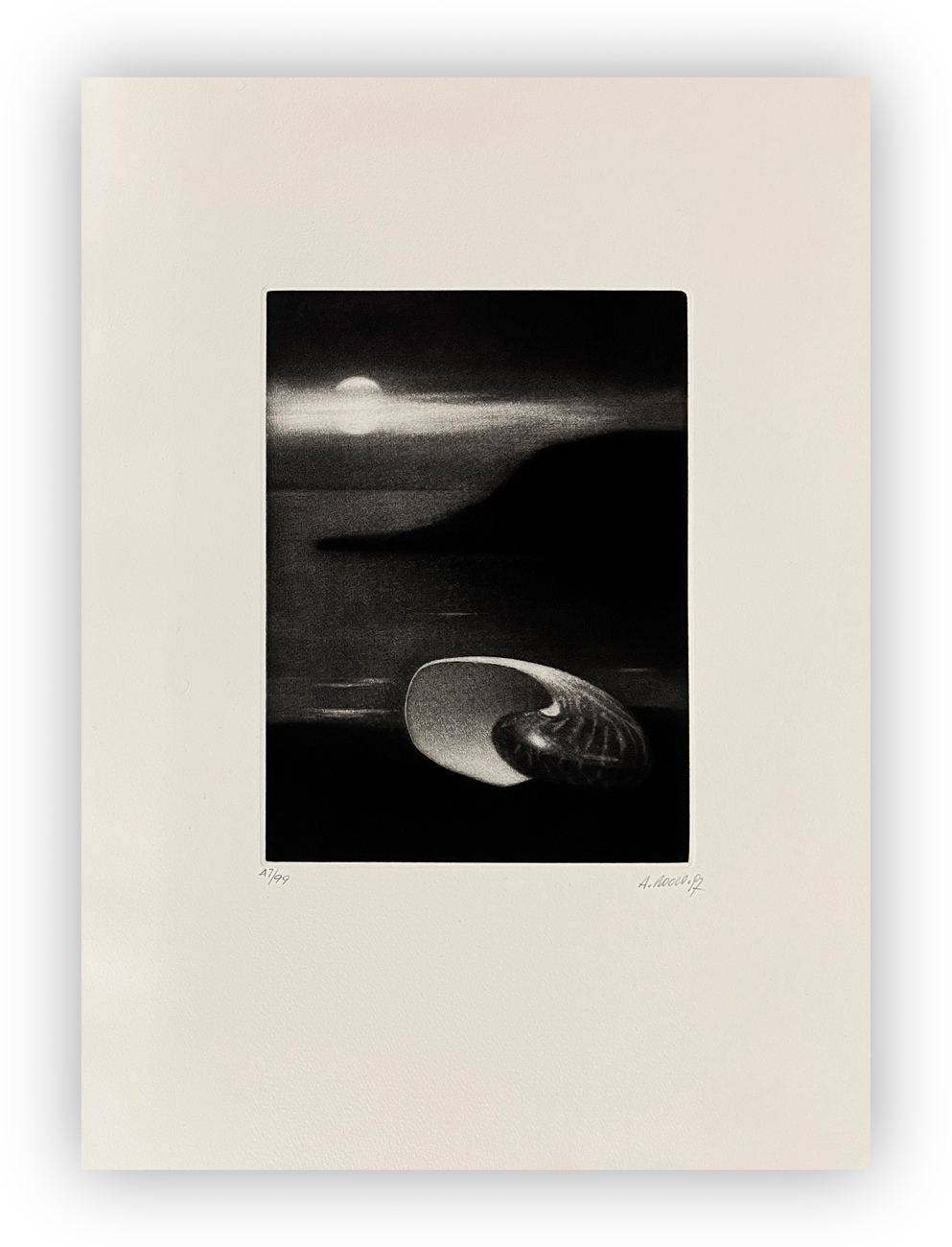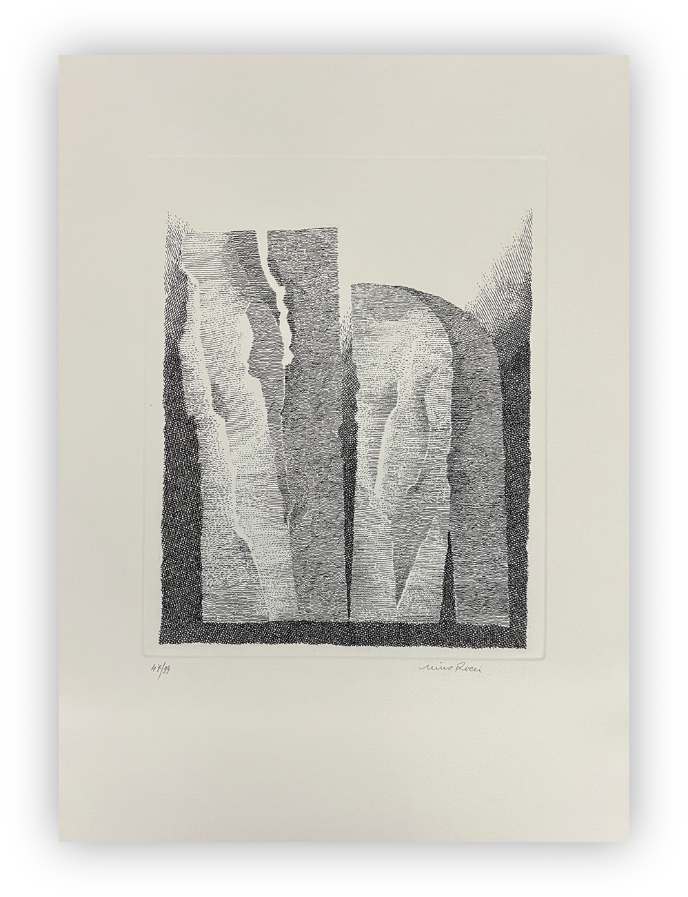 Edizione d'arte contenente una poesia di Giuseppe Bonaviri illustrata da un'incisione di Nino Ricci recante firma, datazione e numerazione (Esemplare 47/99) a matita al fronte