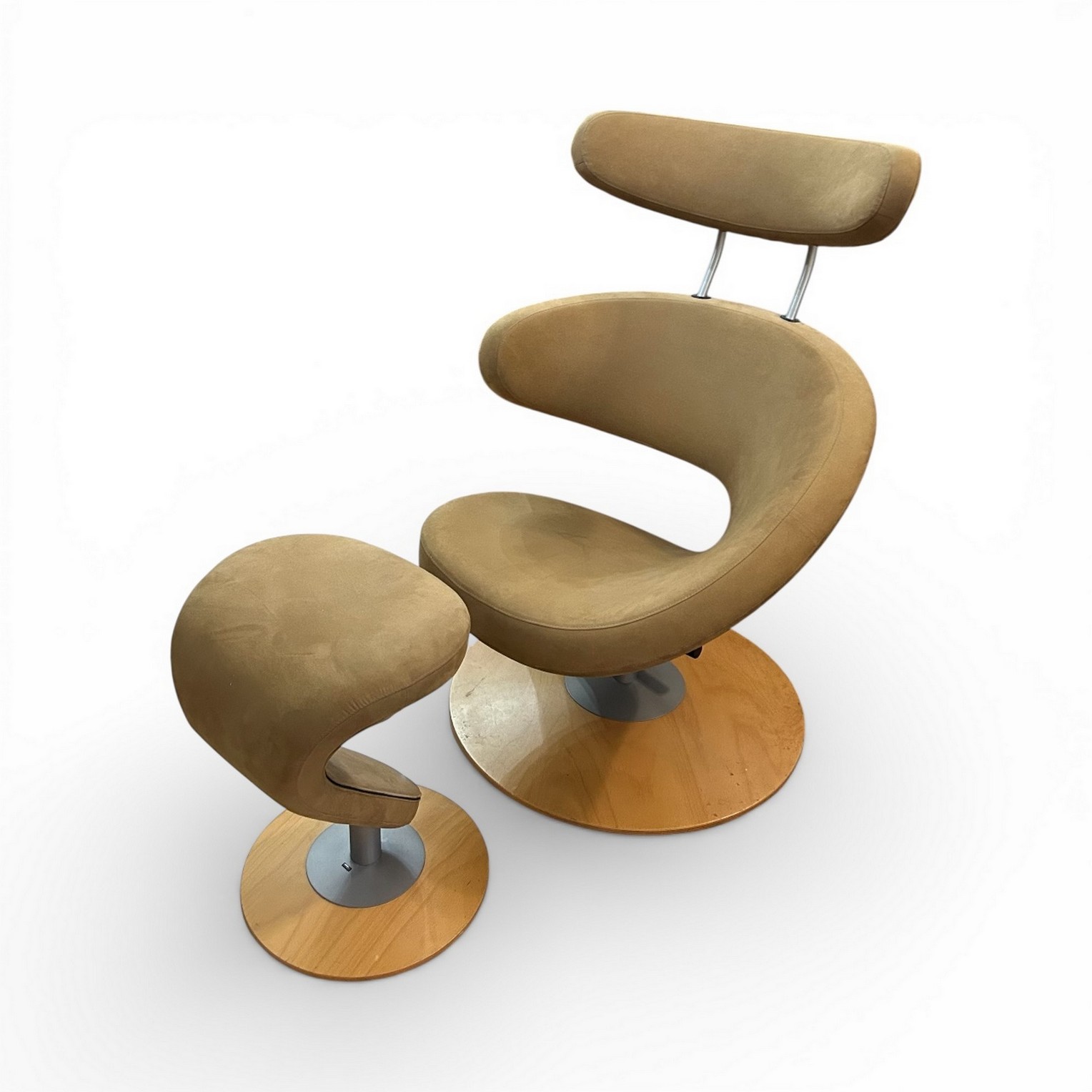 Poltrona con pouf mod. Peel in legno metallo e alcantara produzine Stokke con etichetta alla base