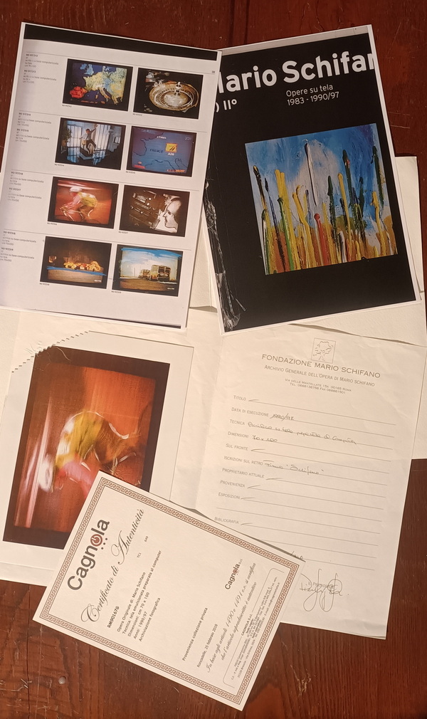 Certificato di autenticitàAl retro: firma dell'autore ed etichetta della Fondazione Mario Schifano (Roma).