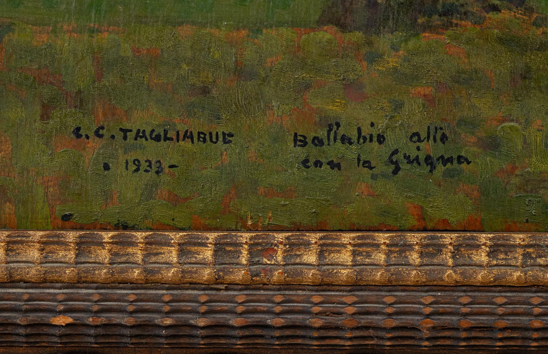 - Il pittore Carlo Costantino Tagliabue e' nato ad Affori (Milano) nel 1880 e morto a Milano nel 1960. Appreso il disegno nelle Scuole di decorazione di Milano, fu dapprima decoratore, poi copista nelle varie pinacoteche e gallerie studiando e riproducendo prevalentemente i maestri dell'antichita'. Dopo queste esperienze, si dedico' soltanto al paesaggio ed alle marine. Esordi' alla Permanente milanese, nel 1905; poi partecipo' frequentemente alle Biennali di Brera e ad altre esposizioni nazionali. Predilige il paesaggio di montagna, che rende con tendenza segantiniana, e due lavori di questo genere sono stati acquistati dalla Banca Commerciale Italiana; alcune marine, fra le quali "La mareggiata" furono acquistate dal Re. Altri dipinti sono conservati in Italia ed all'estero, presso enti e privati. Citansi di lui anche "Sotto le nubi", e parecchi affreschi di carattere religioso. Alla Galleria d'Arte Moderna di Milano esistono: "Notturno" e "Plenilunio a Venezia".Note biografiche tratte dal Dizionario Illustrato dei Pittori, Disegnatori ed Incisori Italiani A.M. Comanducci.