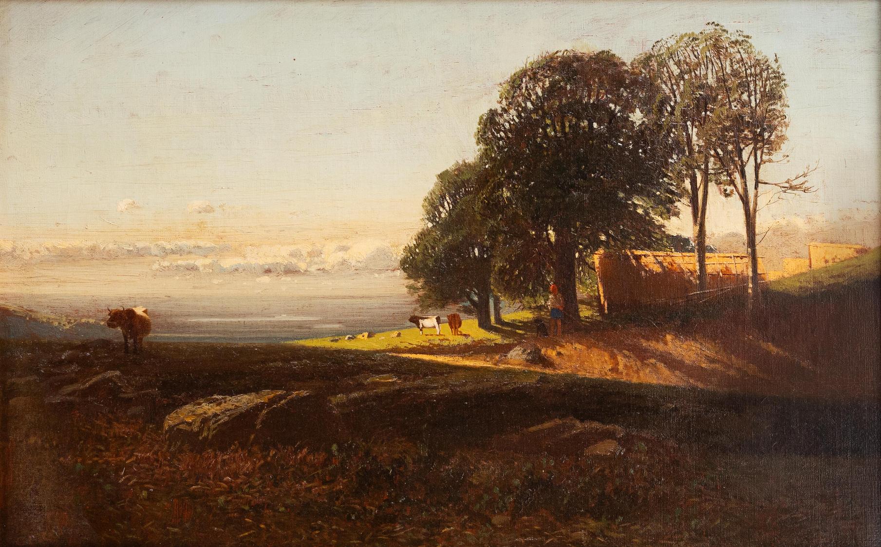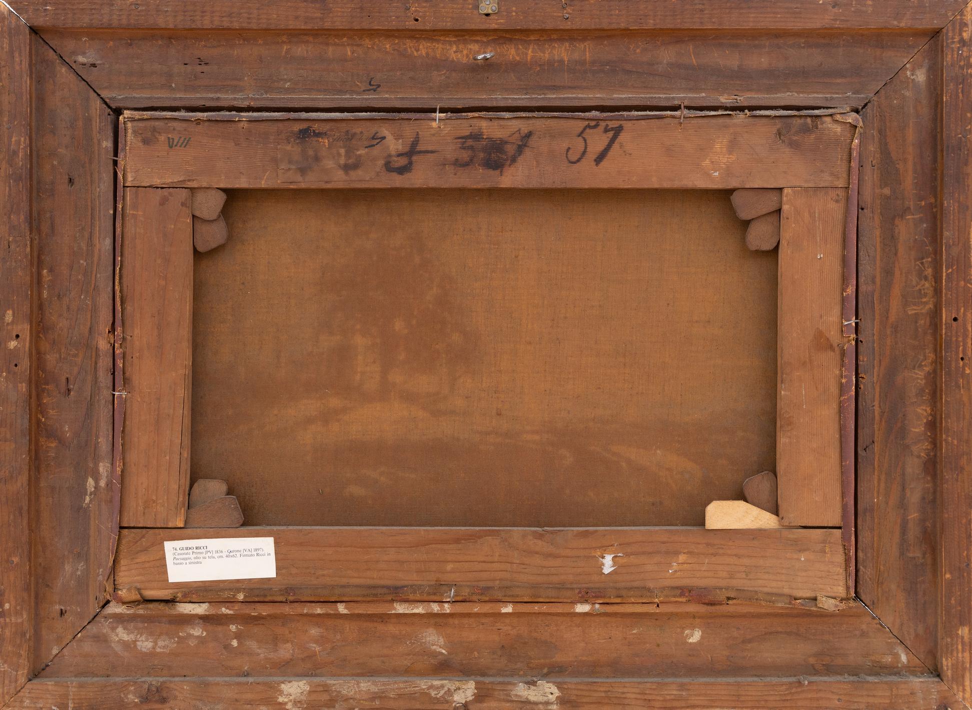 - Guido Ricci fu un pittore italiano dell’Ottocento, tra i più sensibili interpreti del paesaggio lombardo, capace di coniugare osservazione diretta della natura e rigore formale. Nacque a Casorate Primo, in provincia di Pavia, il 6 ottobre 1836 e manifestò fin da giovane una spiccata inclinazione per il disegno e la pittura. La sua formazione avvenne all’Accademia di Belle Arti di Brera, a Milano, dove assimilò i principi della pittura dal vero e maturò un interesse profondo per la resa atmosferica del paesaggio, sotto l’influenza di un insegnamento che privilegiava il contatto diretto con la natura.Il suo esordio pubblico risale ai primi anni Sessanta dell’Ottocento, quando iniziò a partecipare alle esposizioni di Belle Arti, attirando l’attenzione per la freschezza della visione e la sincerità dell’impianto pittorico. I suoi primi lavori, dedicati soprattutto alla vita rurale e ai paesaggi di campagna, rivelavano già una particolare sensibilità per la luce e per l’equilibrio compositivo. Nel corso degli anni Ricci prese parte con continuità alle rassegne artistiche milanesi e nazionali, affermandosi come uno dei paesaggisti più apprezzati del suo tempo.La sua pittura si concentrò prevalentemente sui paesaggi della Lombardia e dell’Italia settentrionale: campagne, rive fluviali, pascoli alpini, boschi e scorci montani. A questi soggetti affiancò talvolta marine e scene di vita all’aperto, sempre caratterizzate da un approccio sobrio e meditato. Con il passare del tempo il suo stile si fece più libero e luminoso, abbandonando gradualmente l’impostazione più accademica per una pennellata più sciolta, capace di restituire l’atmosfera mutevole dei luoghi e delle stagioni.Ricci lavorò con costanza e dedizione per tutta la vita, mantenendo un legame profondo con la natura e con i luoghi che dipingeva. La sua ricerca non fu mai orientata alla spettacolarità, ma piuttosto alla verità del paesaggio, colto nei suoi aspetti più autentici e quotidiani. Questo atteggiamento gli valse il rispetto dei contemporanei e il favore di collezionisti e istituzioni.Morì il 20 agosto 1897 a Gurone, in provincia di Varese.