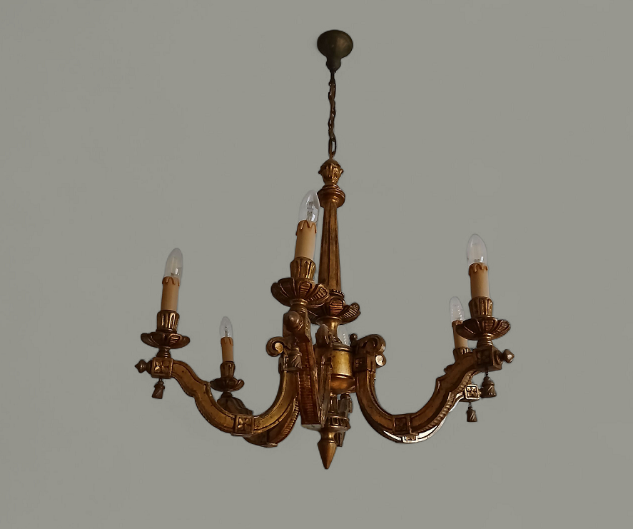 LAMPADARIO A SEI LUCI IN LEGNO INTAGLIATO E DORATO H.CM.70