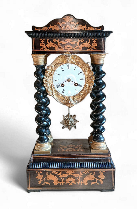 OROLOGIO A PORTICO IN LEGNO CON INTARSI E METALLO SBALZATO E DORATO - DA REVISIONARE - FRANCIA XIX SEC. H.CM.49