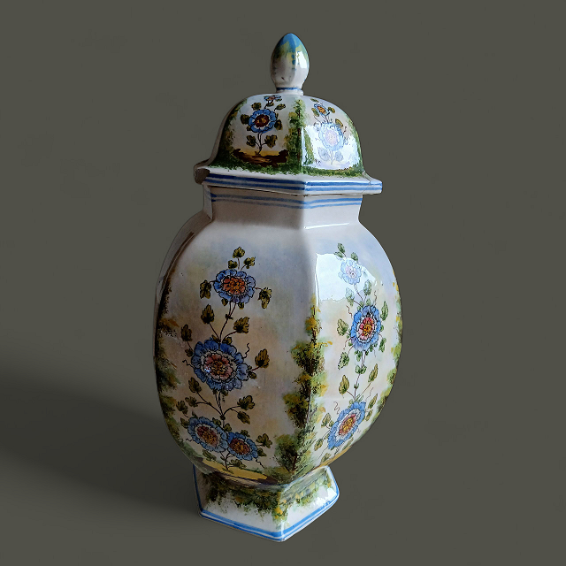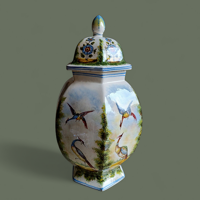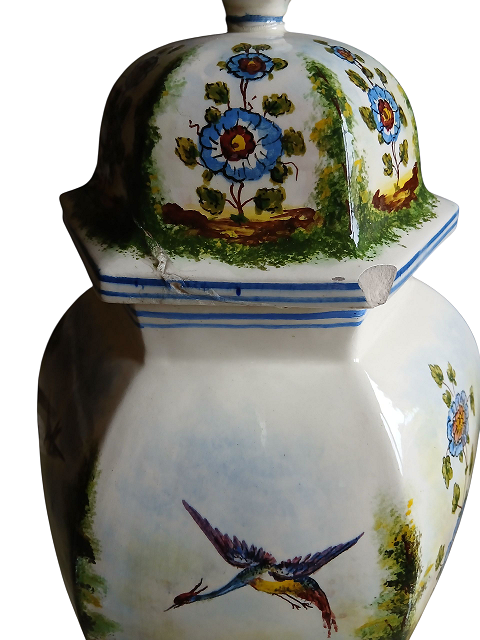 ANTICA POTICHE IN MAIOLICA DECORATA CON MOTIVI FLOREALI E VOLATILI H.CM.45 DIFETTI E RESTAURI