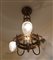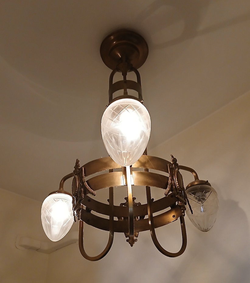 LAMPADARIO DECO' A TRE LUCI IN METALLO BRUNITO DECORATO A MEDAGLIONI E GHIRLANDE E VETRI SATINATI