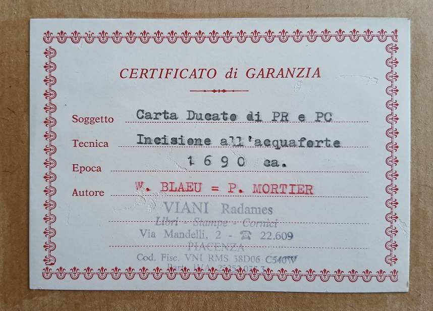 PIERRE MORTIER (1661-1711) CARTA DEL DUCATO DI PARMA E PIACENZA - ACQUAFORTE CM.54X63 IN CORNICE - CERTIFICAZIONE AL RETRO