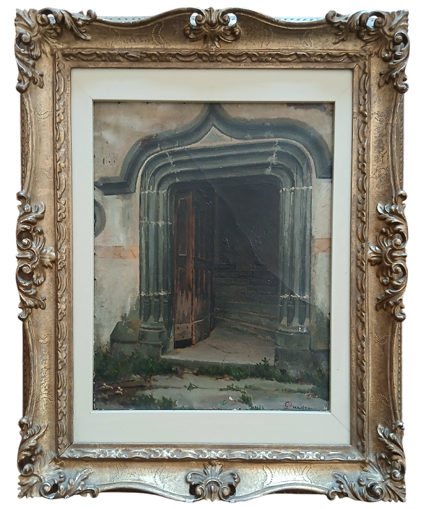 PORTONE DEL CASTELLO DI ISSOGNE - OLIO SU CARTONE CM.34X27 FIRMATO G.B....