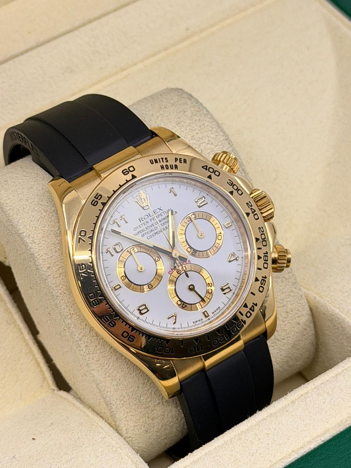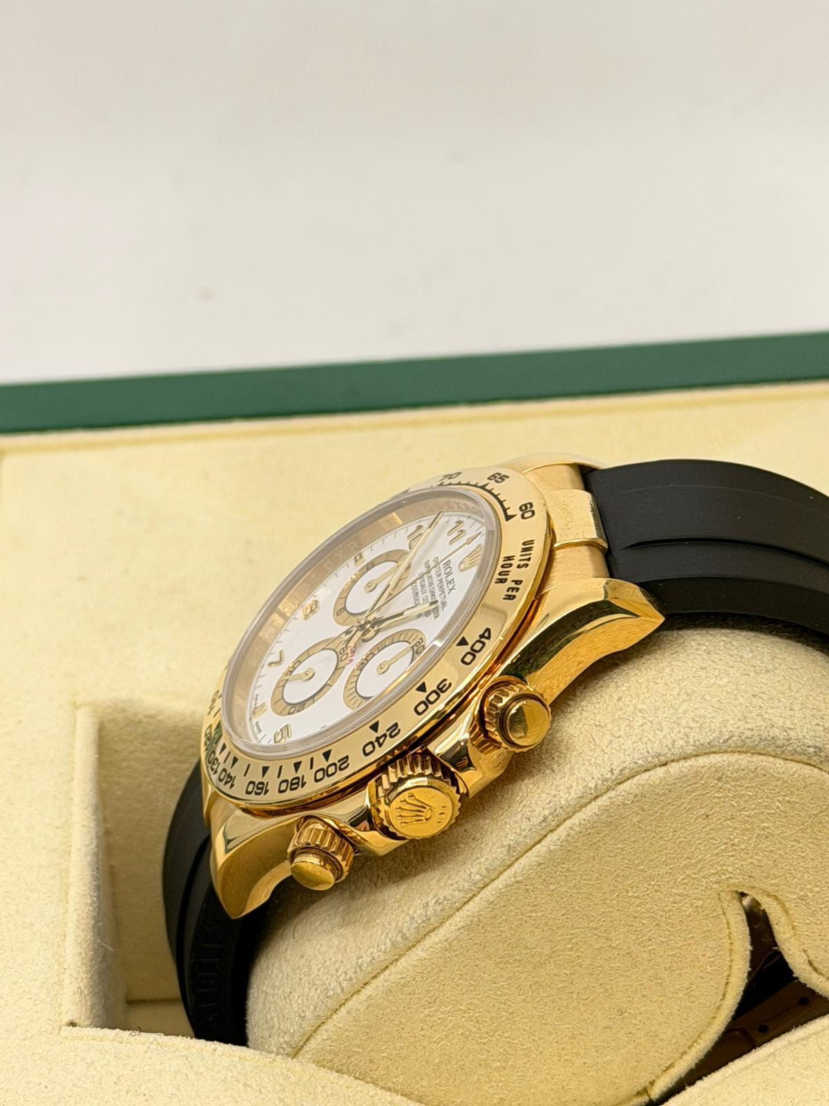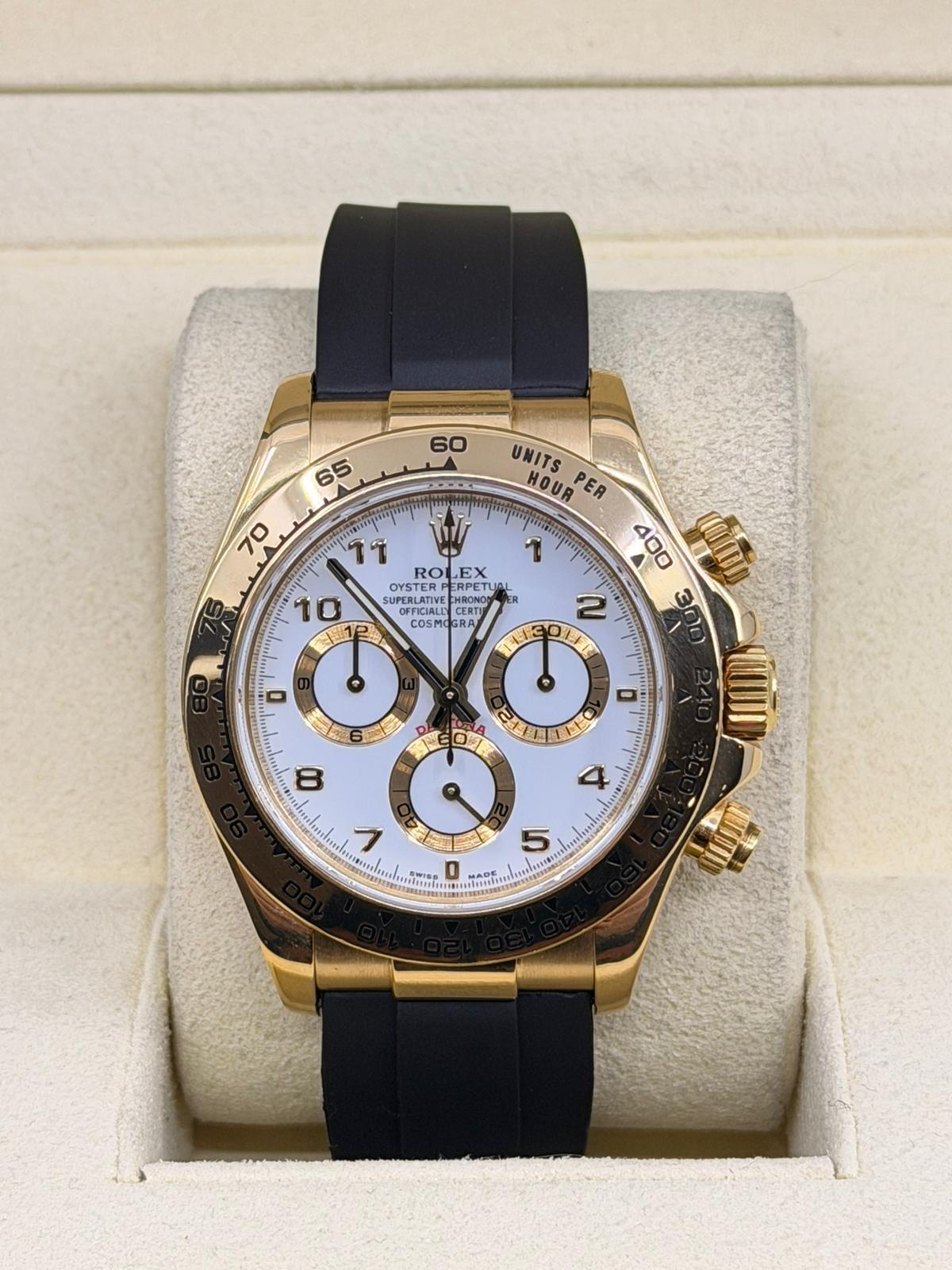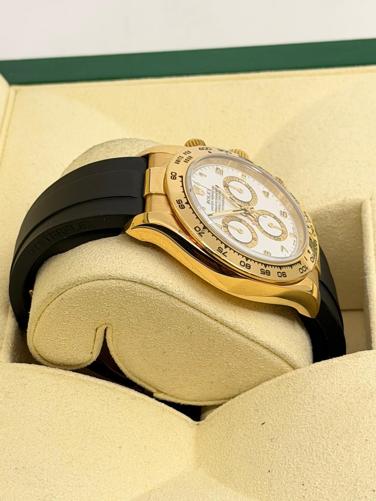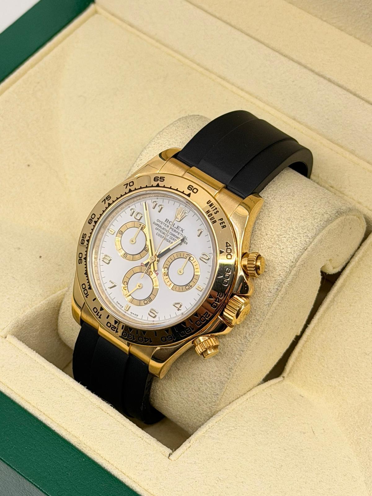 Marca Rolex Modello (Orologio) Daytona Numero di referenza 116518 Carica Automatico Materiale della cassa Oro giallo Materiale cinturino Pelle originale, oysterflex aftermarket Anno di produzione 2005 Condizione Ottimo (di seconda mano, segni di usura assenti o appena visibili) Corredo documenti originali Rolex, no box Cassa Materiale della cassa Oro giallo Diametro 40 mm Impermeabile 10 ATM Materiale lunetta Oro giallo Vetro Vetro zaffiro Chiusura Déployante Materiale chiusura Oro giallo Funzioni Cronografo - COMMISSIONE D’ASTA 25%