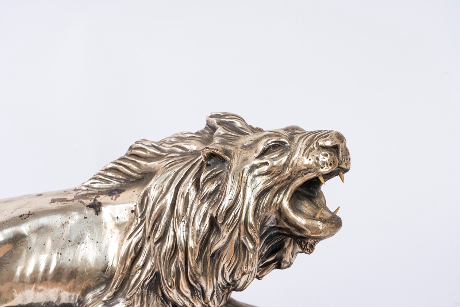 Scultura in terracotta ricoperta con lamina in rame argentato raffigurante leone, prima metà del secolo XX
