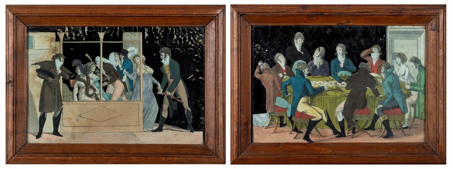 Due stampe sottovetro raffiguranti scene di genere, Inghilterra secolo XIX