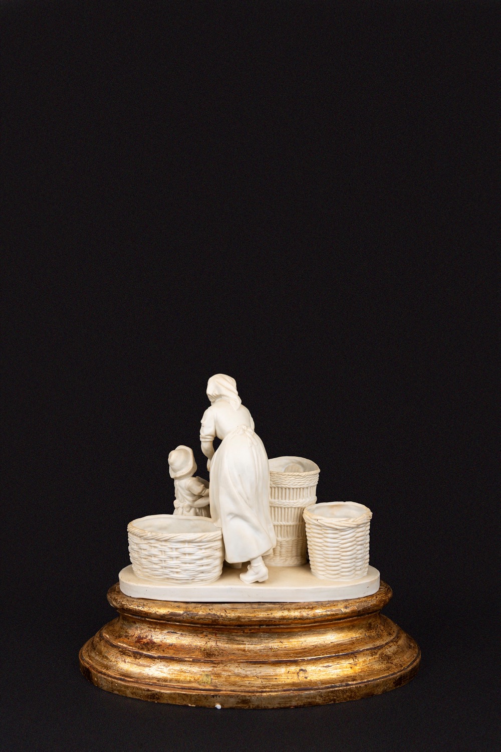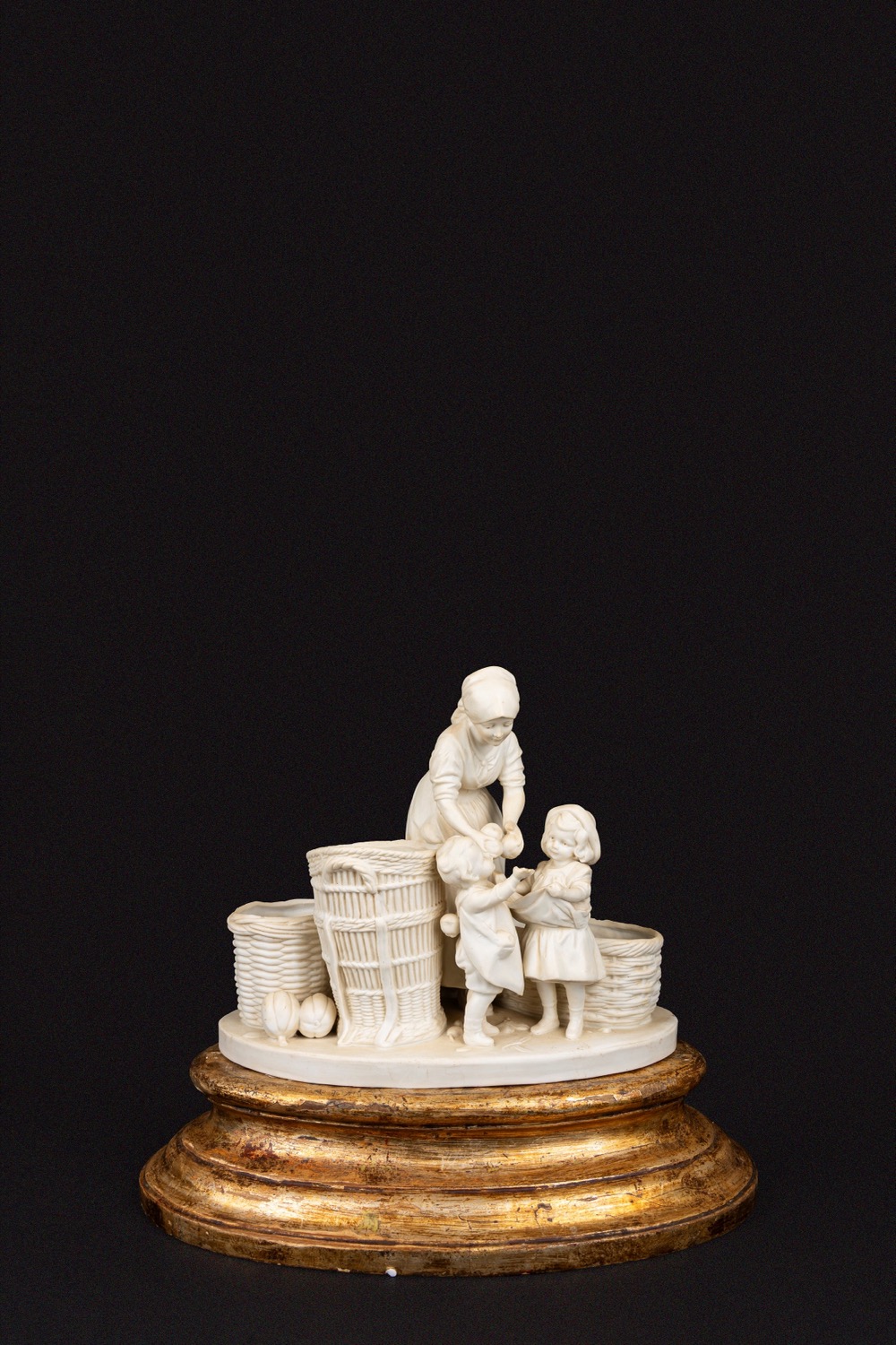 Gruppo scultoreo in biscuit raffigurante venditrice di frutta con due bambini