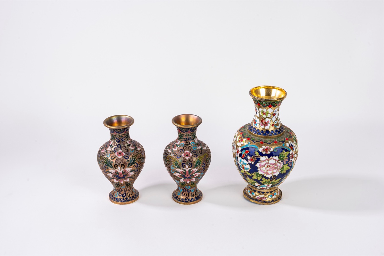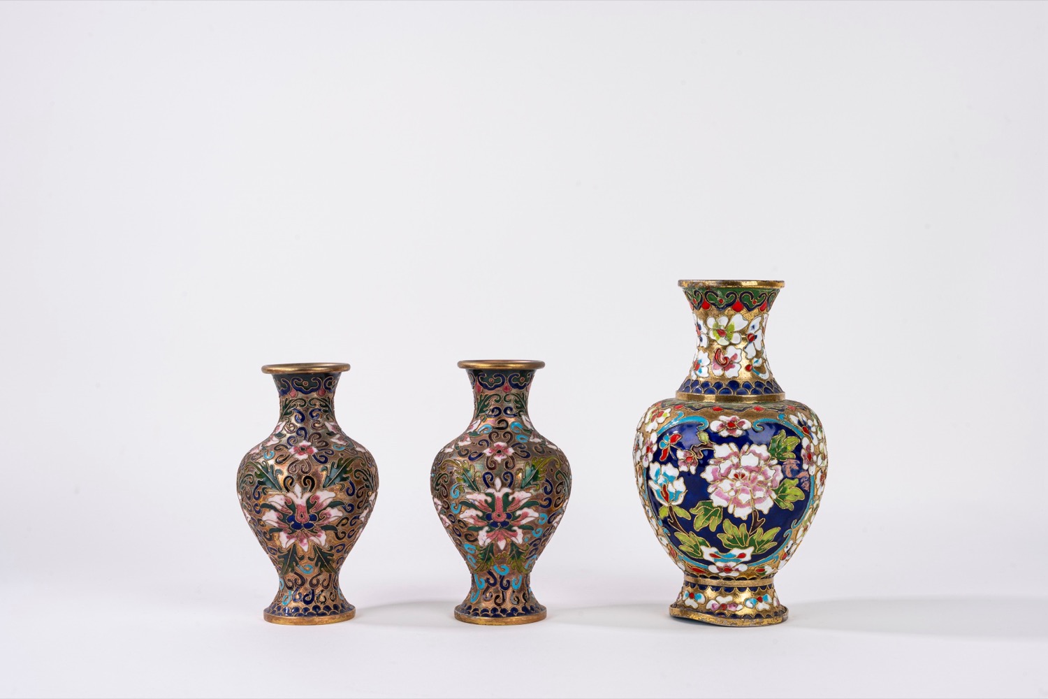 Tre vasetti in smalto cloisonnè, Cina secolo XX