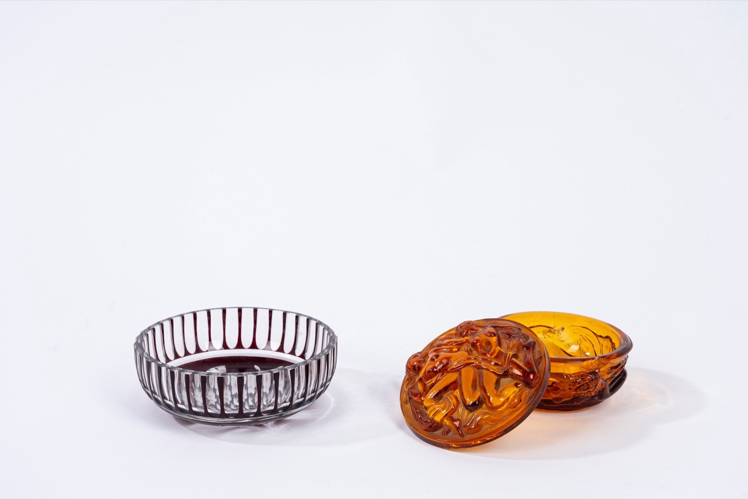 la scatola color ambra con figure di ninfe acquatiche in rilievo sul coperchio e sul corpo; la ciotola in vetro trasparente bordeaux con fiore e farfallala scatola color ambra con figure di ninfe acquatiche in rilievo sul coperchio e sul corpo; la ciotola in vetro trasparente bordeaux con fiore e farfalla