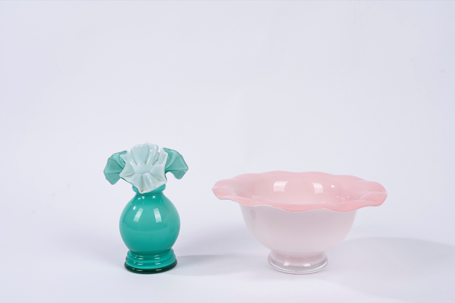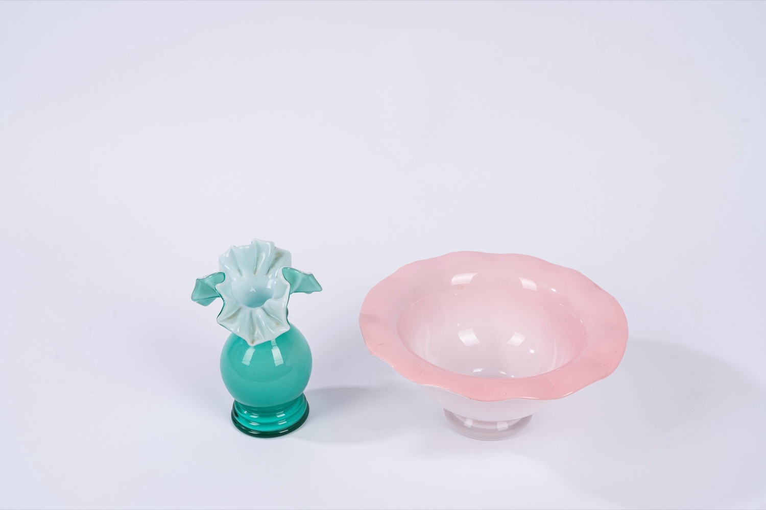 la ciotola in vetro incamiciato rosa, il vasetto in vetro incamiciato in acquamarina con bordo a fazzolettola ciotola in vetro incamiciato rosa, il vasetto in vetro incamiciato in acquamarina con bordo a fazzoletto